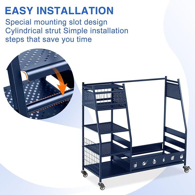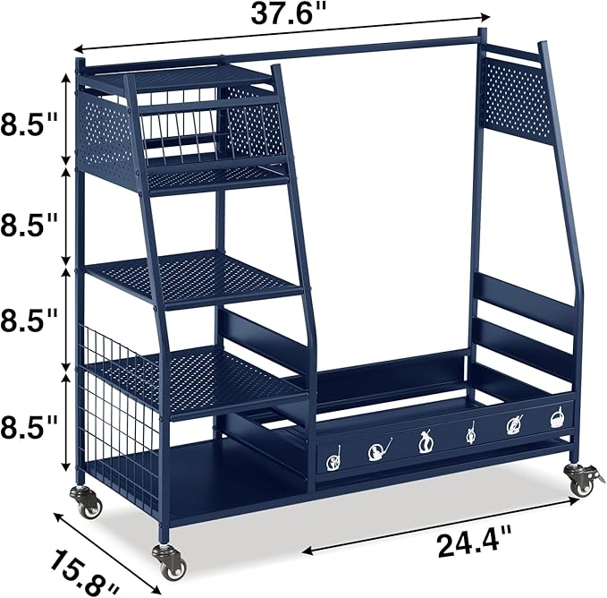 • Easy to Move & Stable When Stationary: The golf club storage stand with storage has 4 wheels that can rotate 360°, and you can push the garage storage stand to wherever you want. 2 of the 4 wheels can be locked, allowing flexible movement while maintaining sufficient stability in the placement position of the golf bag rack holder. The assembled freestanding garage storage station features 37.6'' L x 15.8'' W x 34.3'' H. Please measure where you want to put it before buying