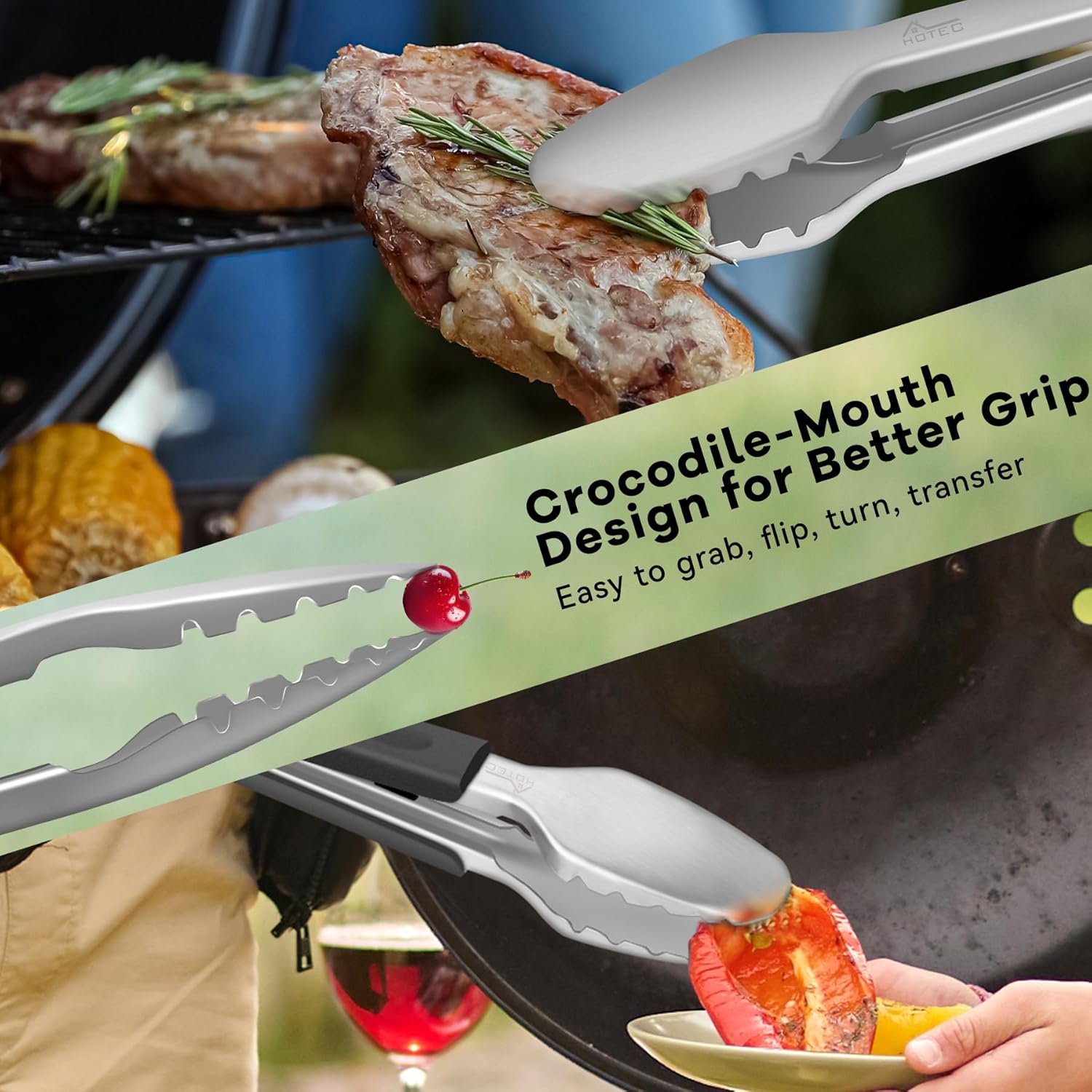 - FOOD LEVEL STAINLESS STEEL: The heavy duty Hotec kitchen tongs built with 1.0 MM Thickened stainless steel, sturdy, heat resistance, anti-rust, anti-corrosion, light weight, easy to handle, like new forever. This tongs for cooking comes with a set of 2, standard 9" cooking tongs and large sized 12" BBQ grill tongs.
