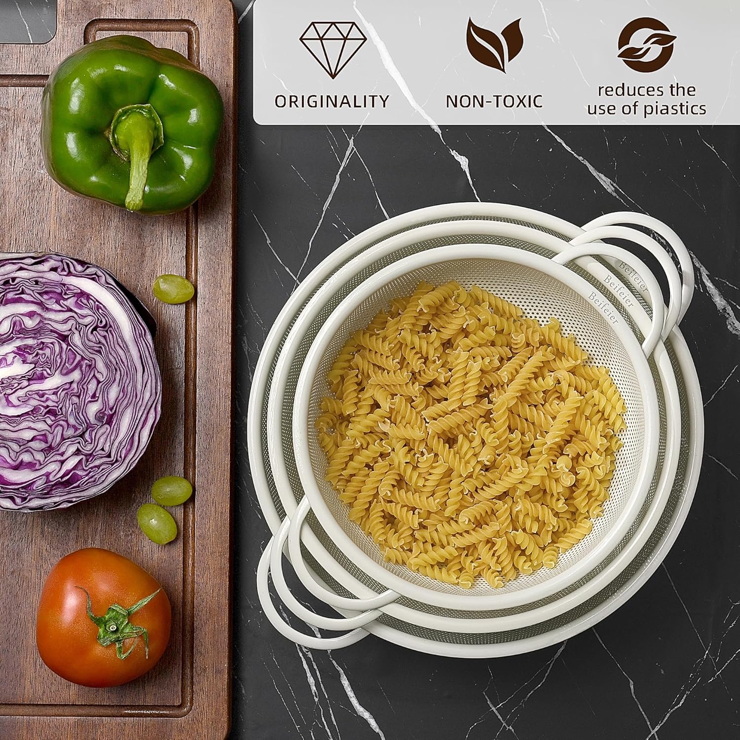 Stainless Steel Colander 3 Piece,Metal Strainer Basket with Solid Base and Handles for Kitchen Food,Pasta, Noodles, Vegetables and Fruits,Powder Coated,BPA Free,Dishwasher Safe,2 & 3 & 4.5 Qt (Cream)