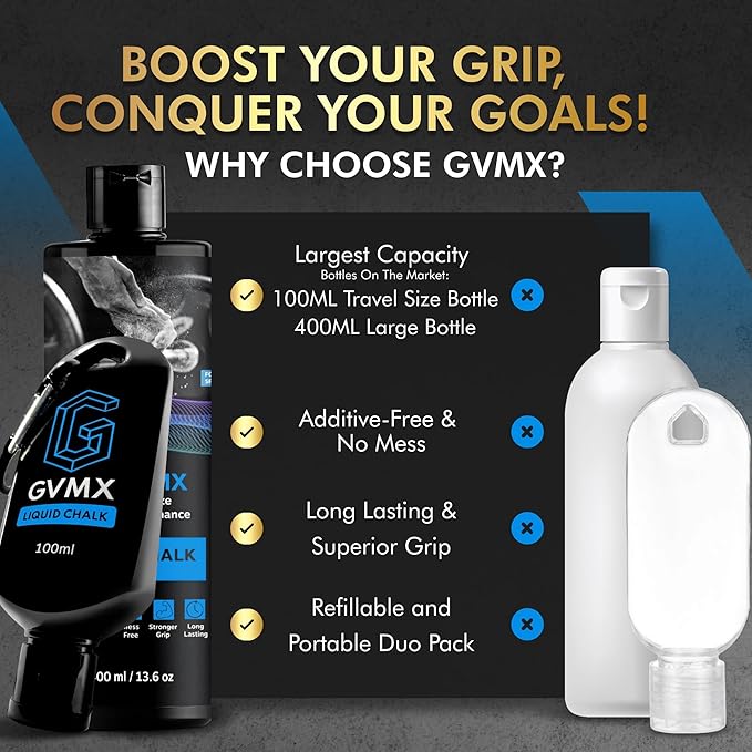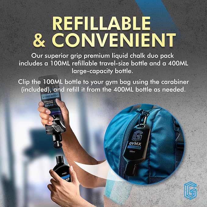 50ML/100ML/400ML Superior Grip Premium Liquid Chalk. Long Lasting Mess-Free Gym Chalk for Weightlifting, Gymnastics, Climbing. Fast Drying Refillable Gym Accessories. Package May Vary.