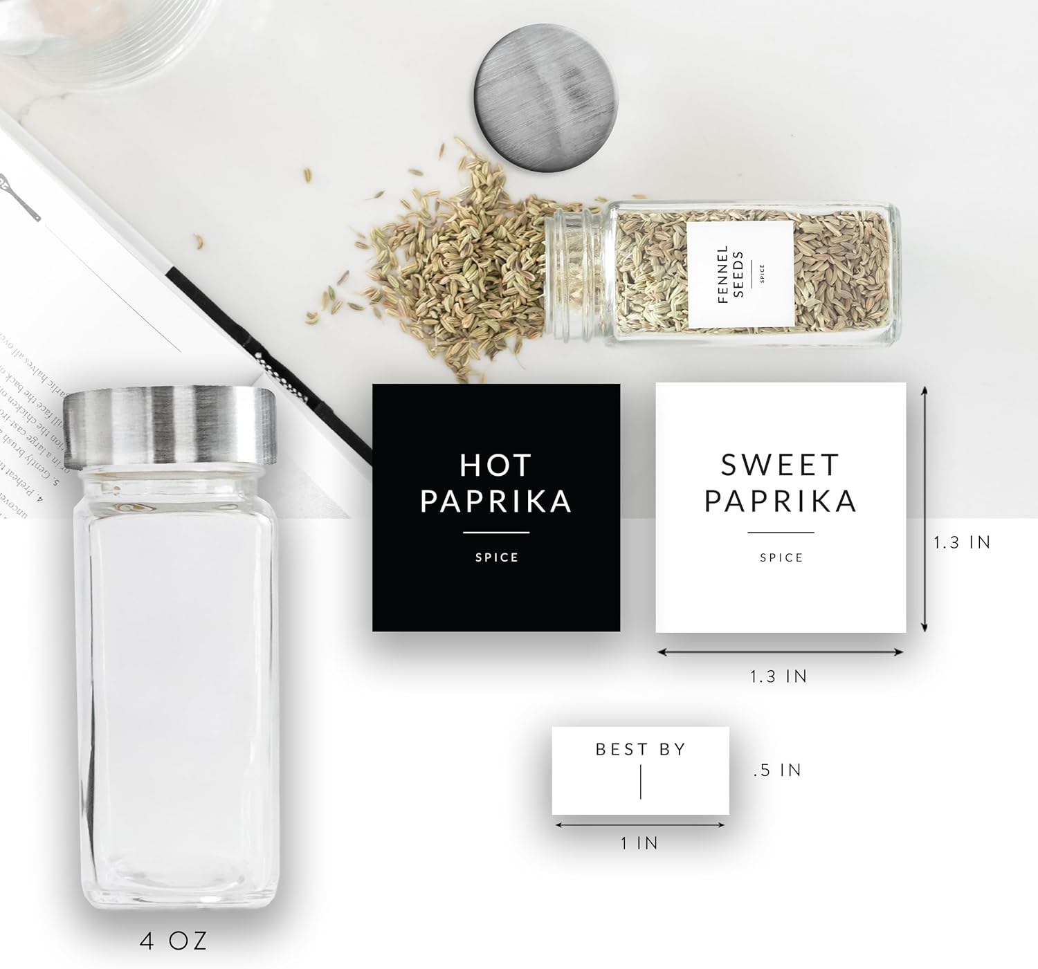 - 374 SPICE LABELS STICKERS - Complete Square Spice Jars Stickers Sets in Minimalist Labels design including a White Spice Labels, Black Labels, and 88 Food Date Expiration Labels to keep your Kitchen Organized and your Spices Fresh.