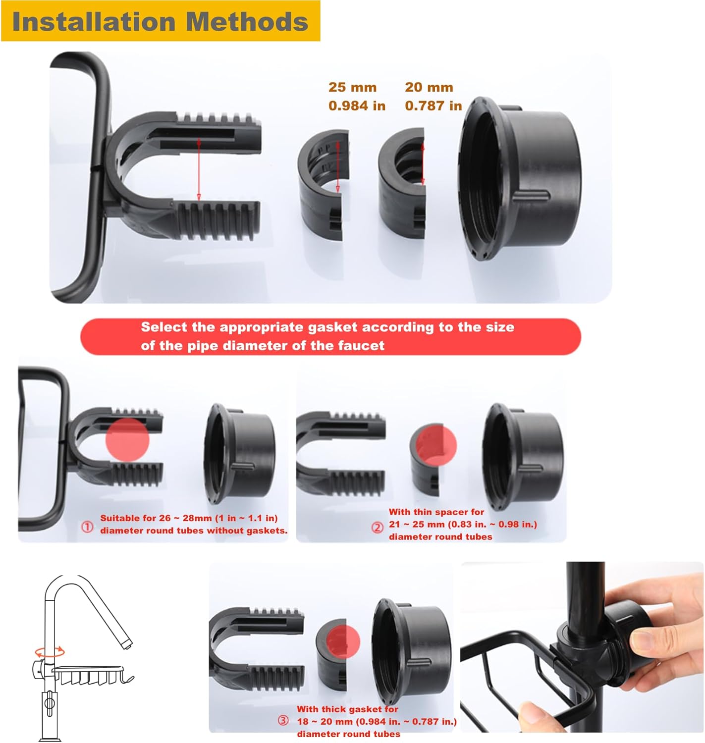 - 【easy installation】No tools are required. Simply insert the product onto the faucet rod and tighten the knob. Easy to install and remove, will not damage or stain your sink. The faucet sponge holder can be used not only for the kitchen sink but also for the bathroom to store shampoo, soap and other items, eliminate clutter and better organize your sink and countertops. This faucet holder is very suitable for your kitchen and bathroom.