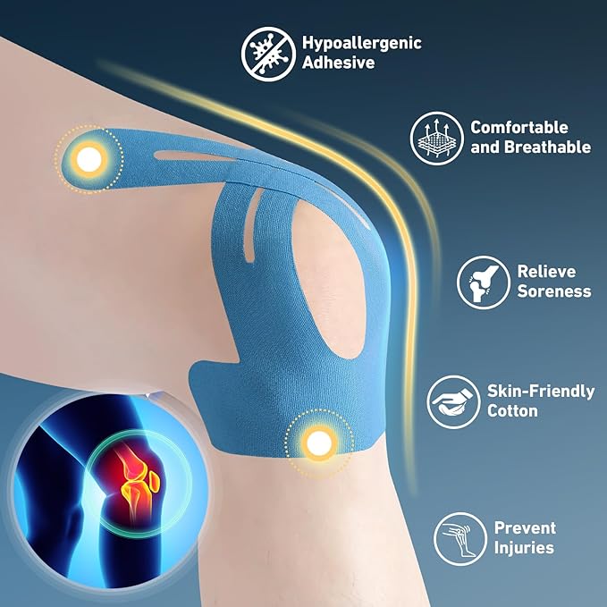 - BREATHABLE AND SKIN-FRIENDLY COMFORT - This k tape for knee features improved airflow and a hypoallergenic design to prevent irritation. The athletic tape is lightweight and flexible, ensuring all-day comfort.