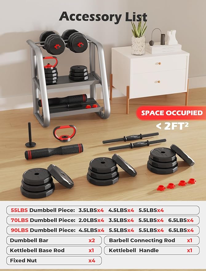 - 3-in-1 Multifunctional Dumbbell Set: The UKEEP Adjustable Dumbbell Set combines dumbbells, barbells, and kettlebells into one versatile package. With adjustable weights ranging from 55lbs, 70lbs, to 90lbs, it's perfect for various fitness exercises, including bench presses and squats. Ideal for both home gyms and professional use.