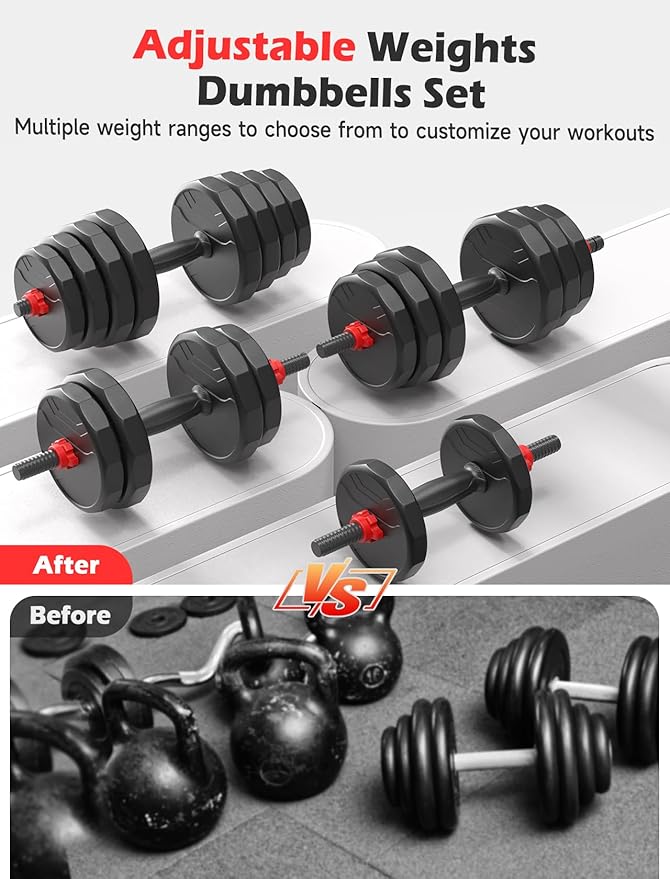 - Quick and Easy Adjustments: This adjustable dumbbell set allows for quick and easy weight changes, with a single dumbbell's adjustable weight range from 7lbs to 27.5lbs/4lbs to 35lbs/9lbs to 45lbs. The detachable design makes weight adjustments simple, ensuring you can switch between different exercises seamlessly, from light workouts to intense training sessions.