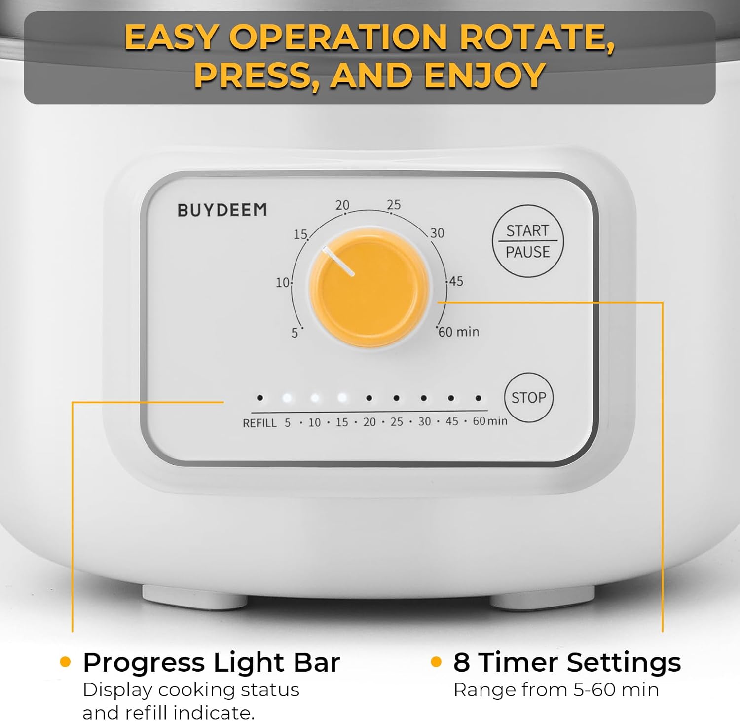 - 8-Time Settings - Choose from 8 cooking durations (5–60 mins) to steam various foods, including vegetables, eggs, seafood, baby formula, and more. The clear progress light bar keeps you informed of the cooking stage.
