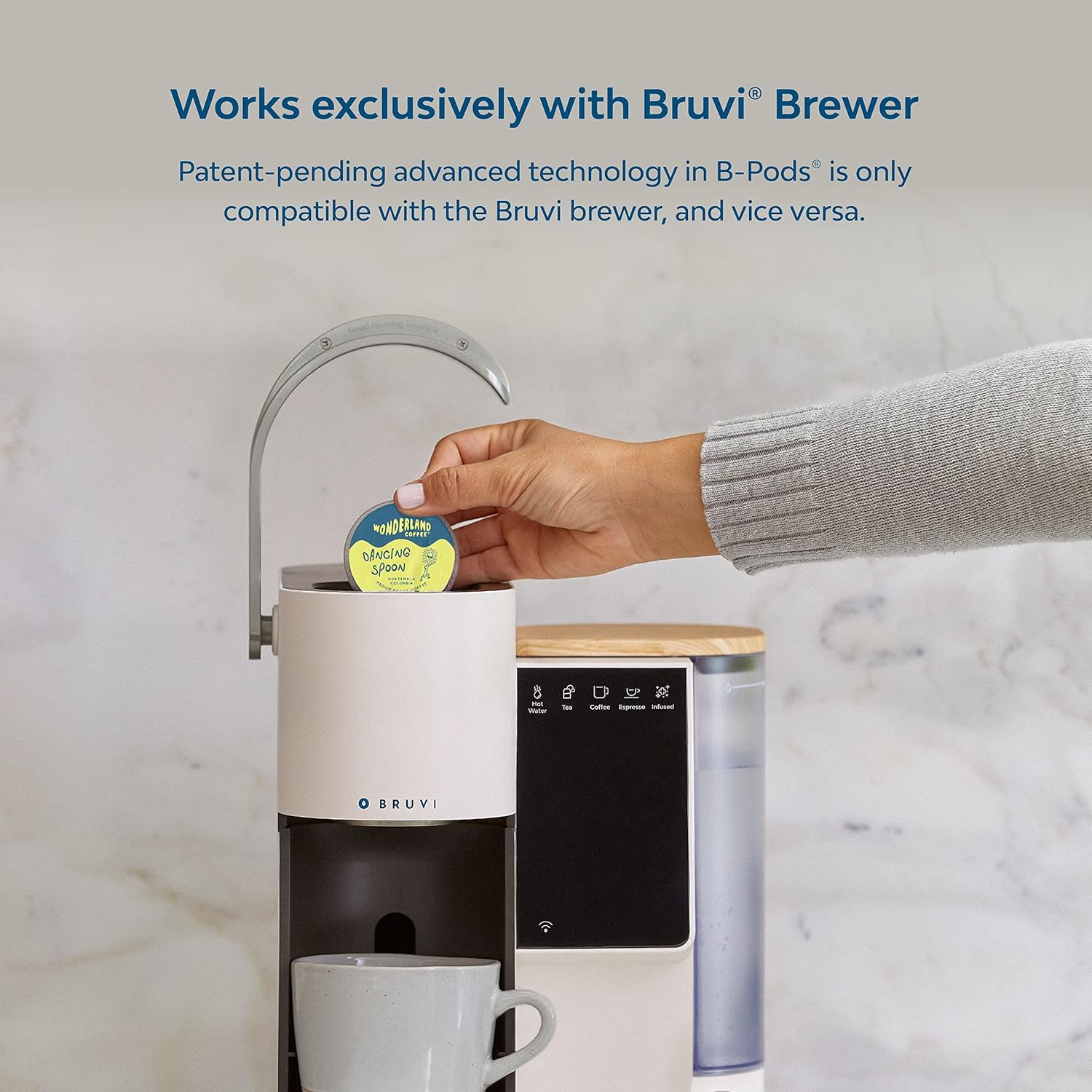 - BRUVI STARTER BUNDLE CONTENTS: The Bruvi brewer, a variety pack of 20 B-Pods, reusable canvas bag plus 60 Wonderland Coffee Dancing Spoon Medium Roast Coffee B-Pods