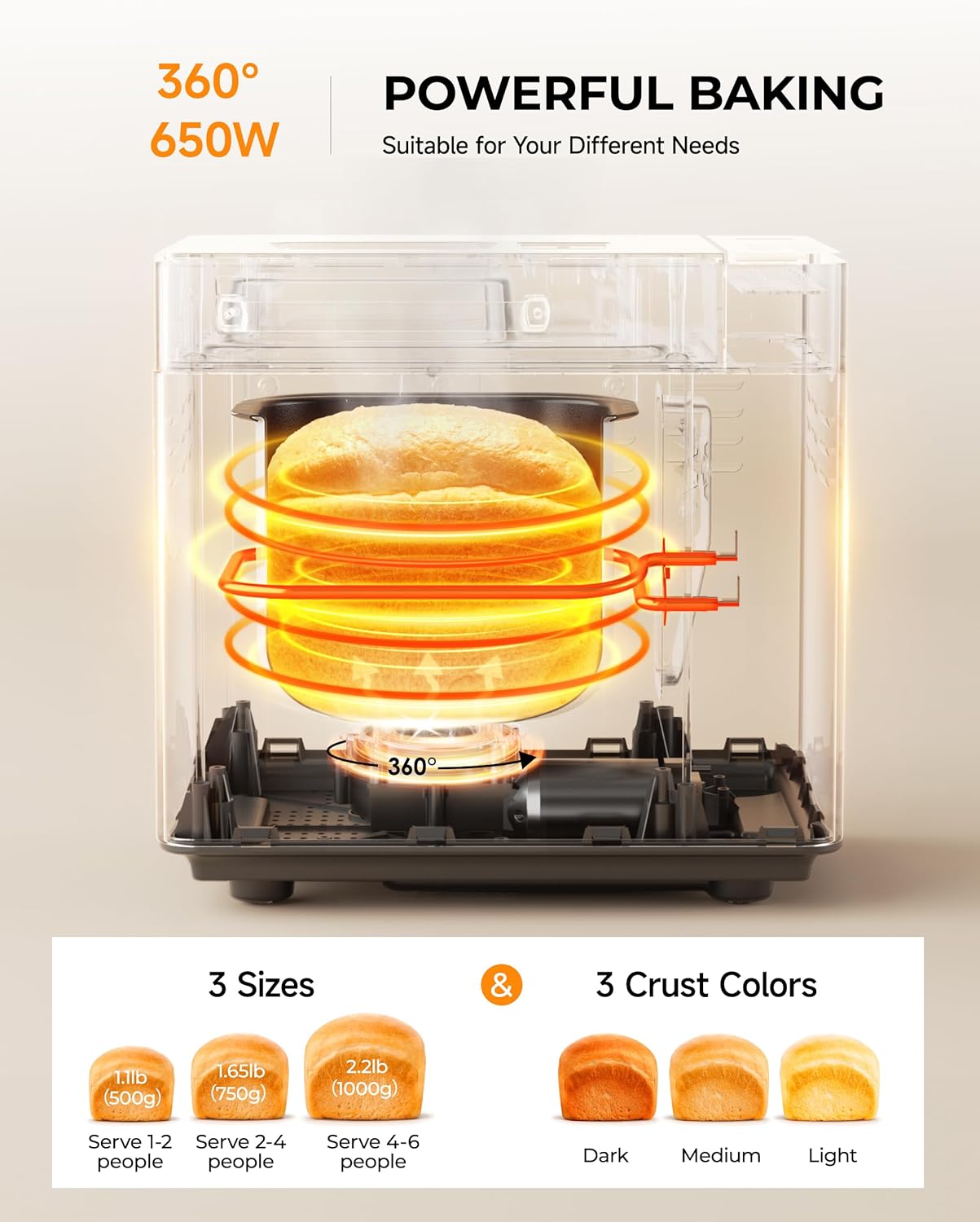 - ๐๐๐๐ ๐๐จ๐ฐ๐๐ซ๐๐ฎ๐ฅ ๐๐๐๐ญ๐๐ซ ๐๐ข๐ญ๐ก ๐๐ฎ๐ข๐๐ญ ๐๐จ๐ญ๐จ๐ซ: Our bread making machine with 650W motor is able to provide you the rapid baking, and you can enjoy your bread in less time by using our ultra fast mode, and ensures even heat distribution for perfectly golden 360ยฐ crusts with a soft, fluffy interior. Moreover, our automatic bread maker's advanced noise reduction technology can minimize noises to 60 dB, making it an excellent choice for those who prefer to bake early in the morning or late at night