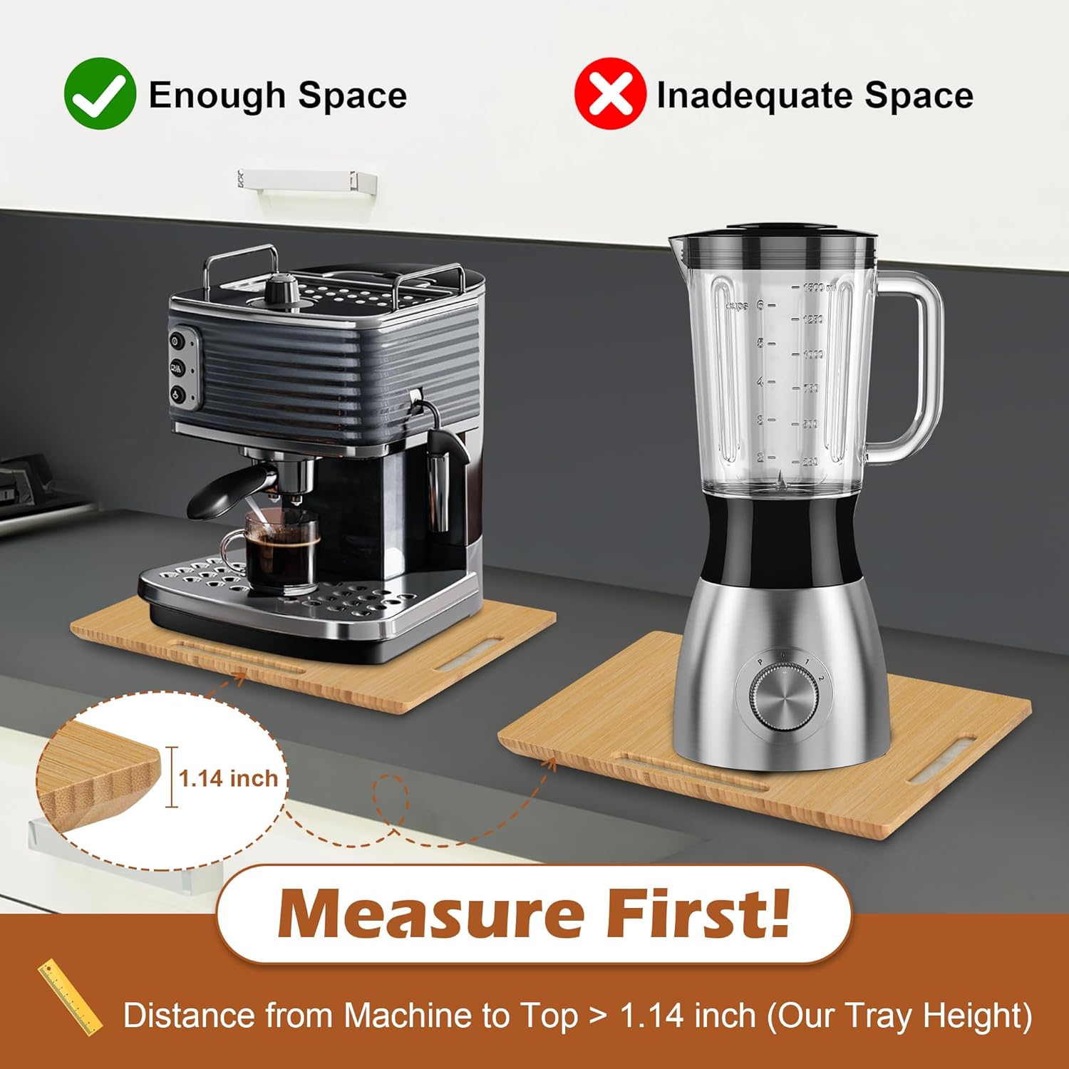 - Easy to Use: No installation needed. Rubber rolling wheels ensure your countertop sliding tray move smoothly on marble, wood and other surfaces in any direction, protecting your countertops. Note: The tray is 1.14" tall. Make sure your appliance and cabinet clearance exceed 1.14"