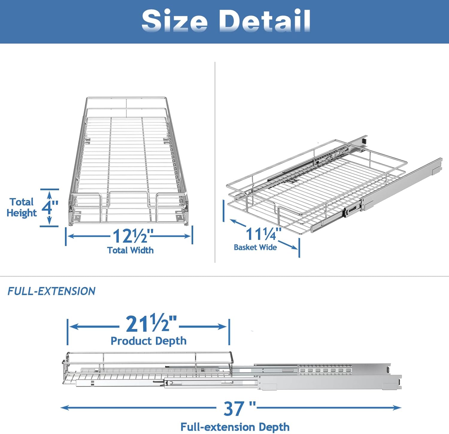 - 【Easy to Put Together and Install】 Our pull out cabinet organizer includes step by step instructions along with all of the hardware necessary for easy installation. Installs with just screw gun to drilled the holes follow the diagram install the rails, and then put the basket on the rails. Installation can be completed under 10 minutes.