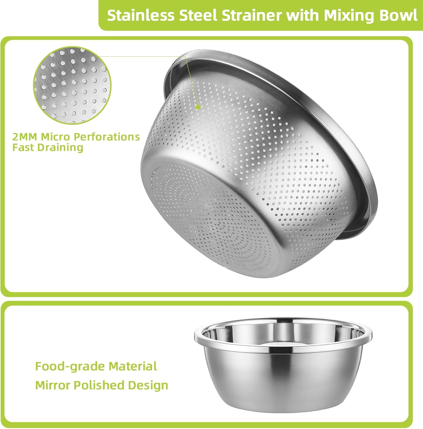 - SUITABLE KITCHEN DIMENSION: Holds 2 quart items. The combination of the stainless steel strainer and mixing bowl makes it easy to clean and prepare food, becoming an indispensable tool in your kitchen