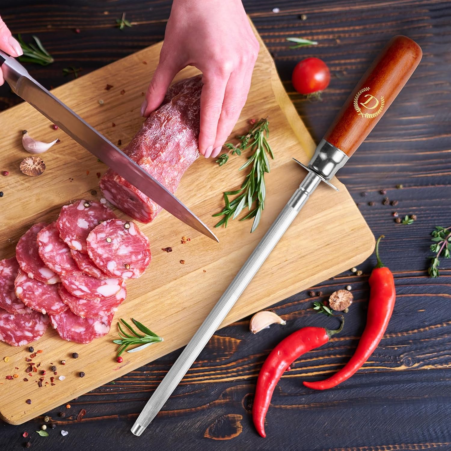 Knife Sharpener Rod, Kitchen Knives Sharpener Carbon Steel Professional Knife Sharpening Steel, Honing Rod with Hanging Holes (13 inches), D
