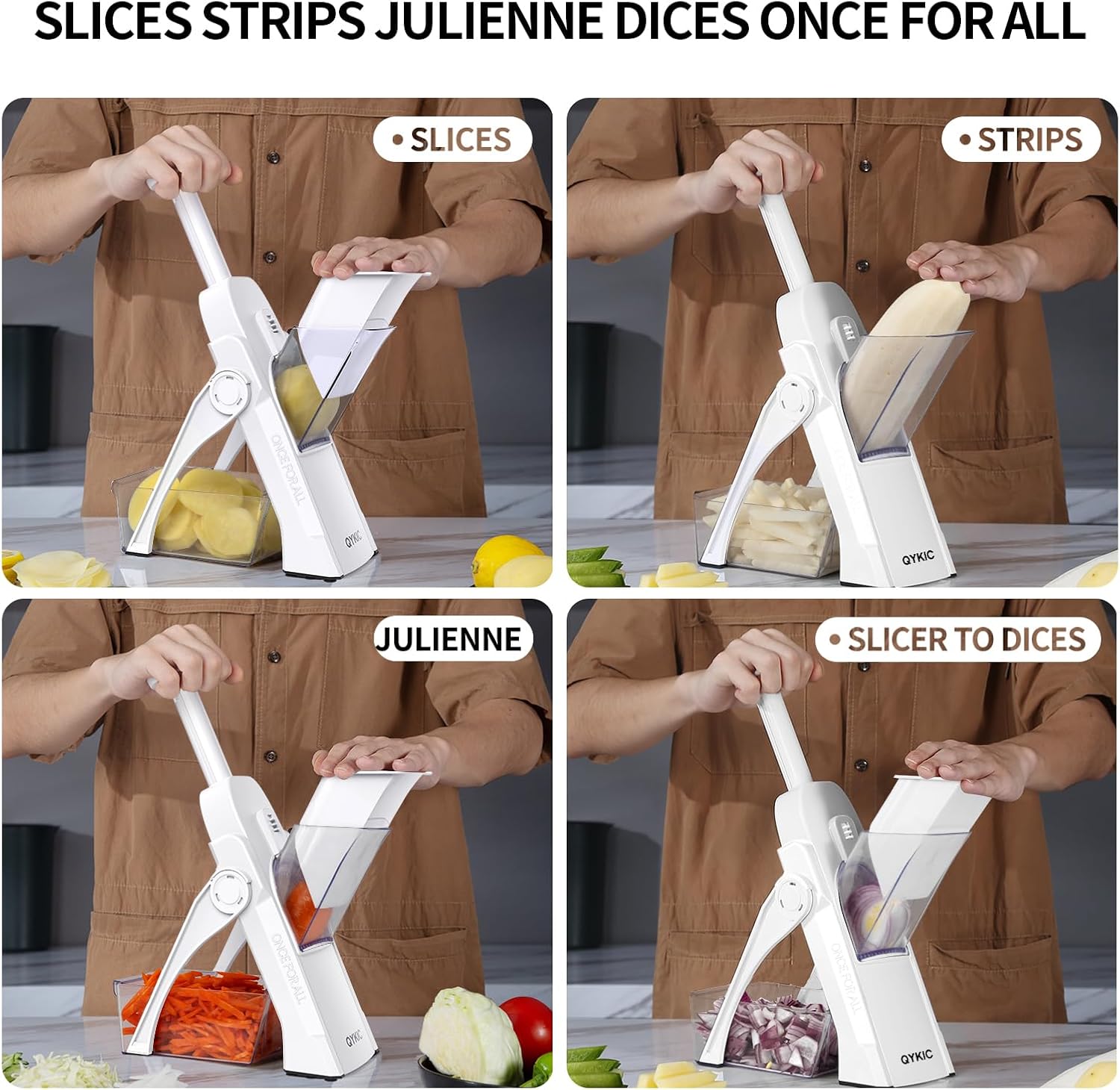 - SAFETY MANDOLINE SLICER: This mandoline slicer whit build-in blades design, no need to touching blades,safe & quickly slicing vegetable & fruits, easy to set up and clean up.Quickly prepare potato slices, lemon onion slices, cucumber slices, carrot slices, etc, which makes your kitchen work simple and efficient.