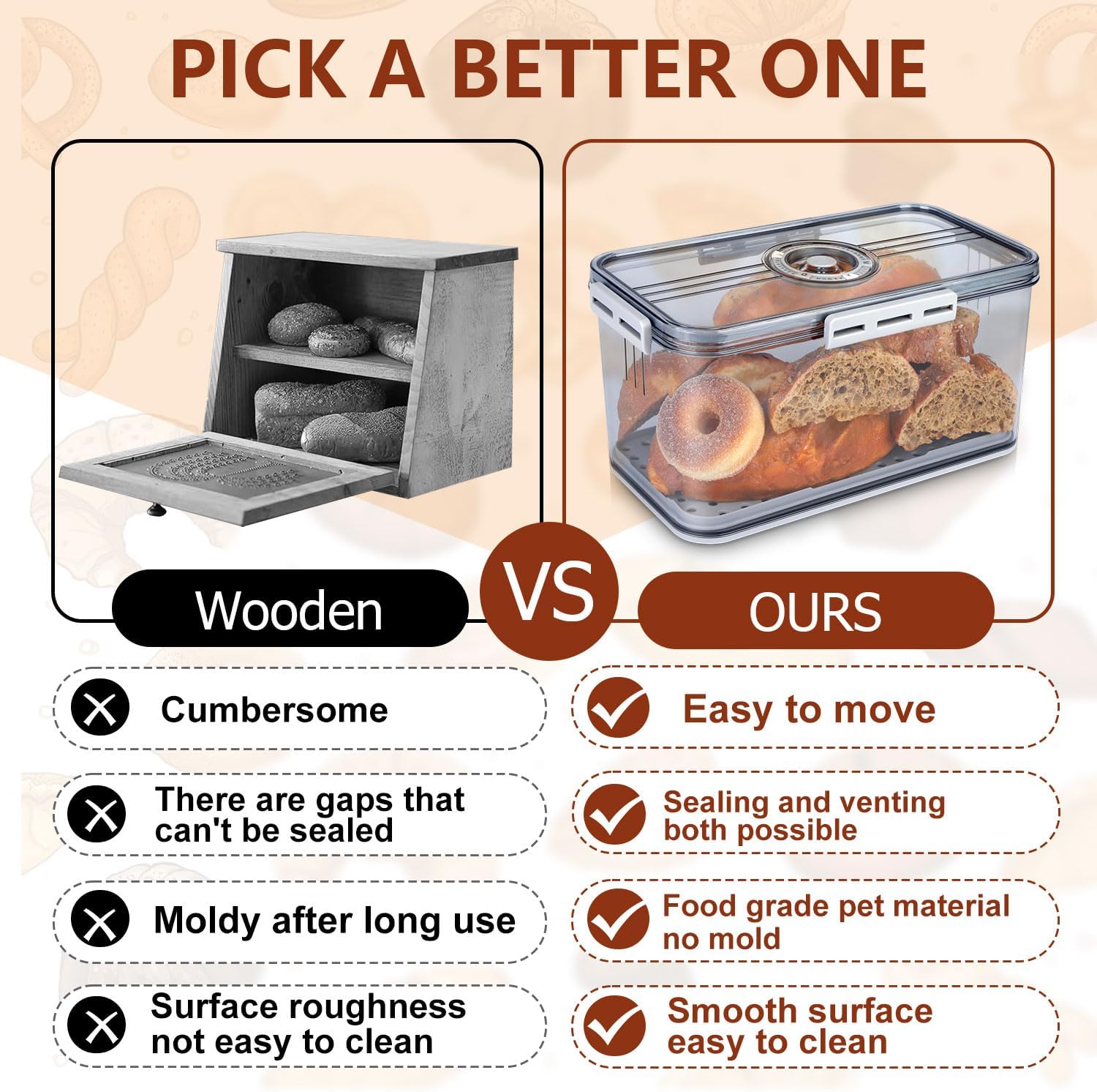 - Why Choose Us:Compared to the wooden breadbox,our bread storage container is easy to clean and the material of the bread keeper box will not get moldy after years.Compared with the long strip shape bread container,our bread storage box is wide and suitable for putting different shapes of bread.Our bread bin is sealed for resistant to moisture.Have an air valve on the bread box lid,optionally release hot bread airflow or seal against moisture