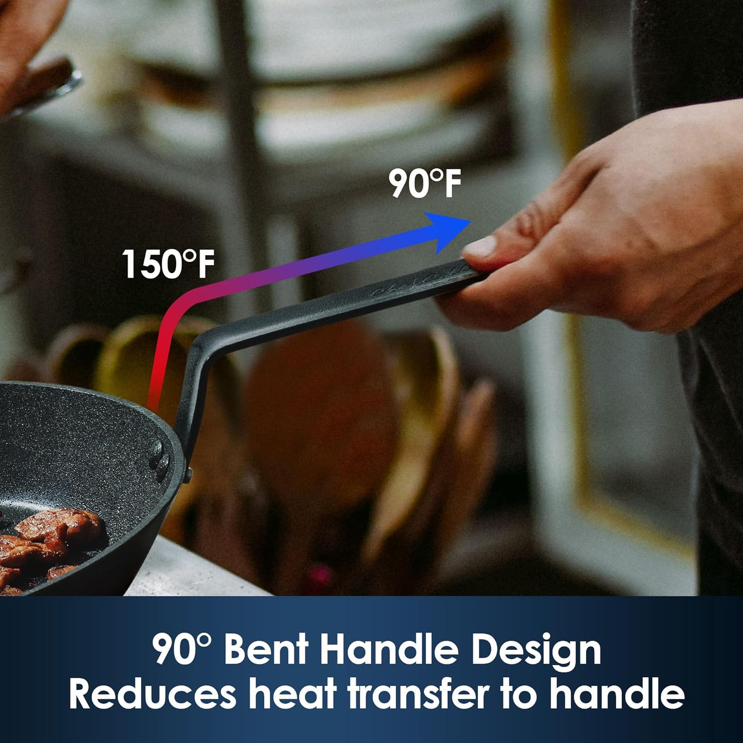 - Ergonomic Handle Design: The nonstick skillet features an ergonomically designed handle with a raised tail to relieve elbow pressure and prevent the handle from getting too hot during cooking.