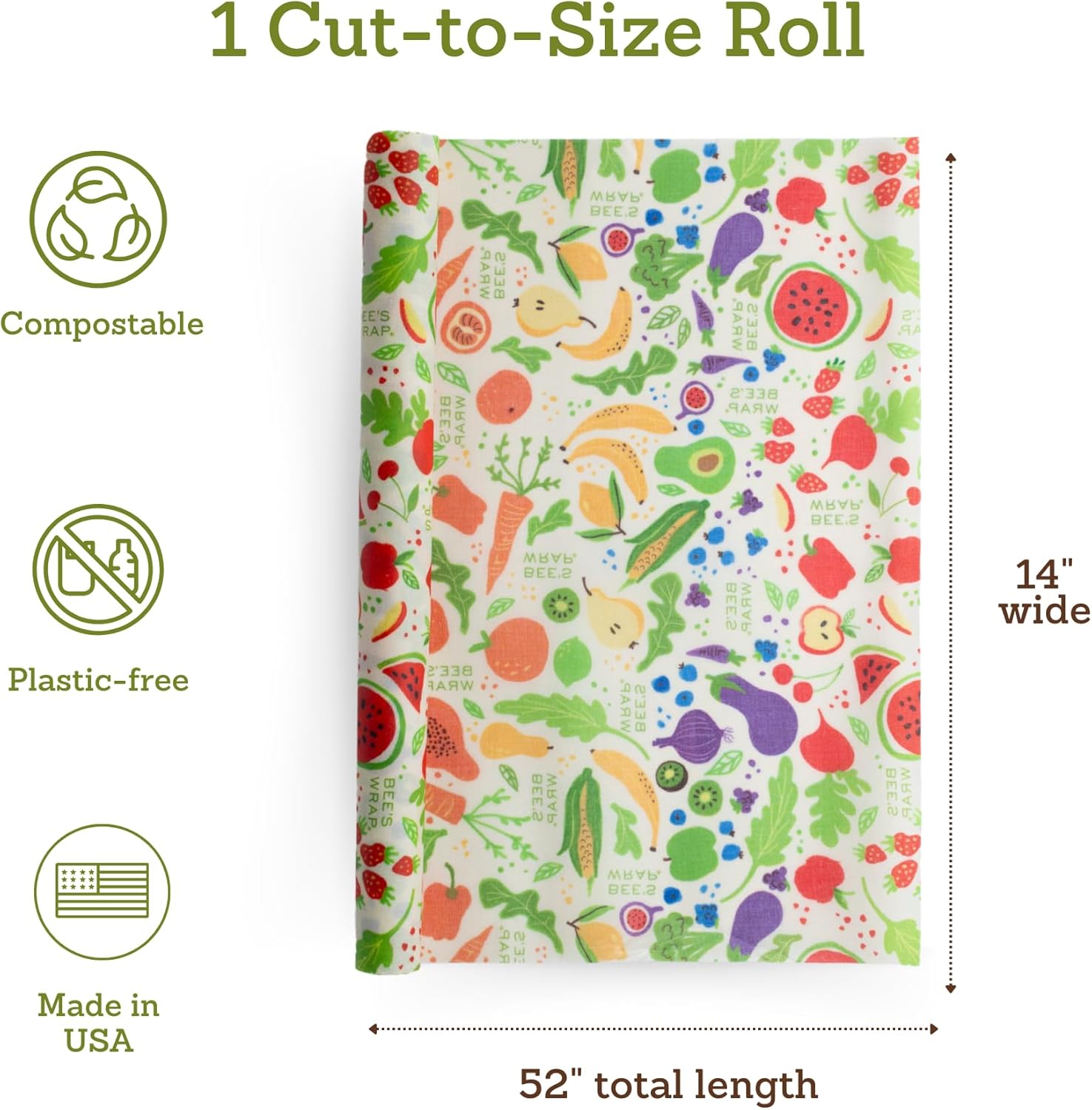 - BEESWAX WRAPS FOR FOOD in a large 14" x 52" wax paper roll featuring a colorful fresh fruit and vegetable design. Made in USA reusable beeswax food wraps are a great alternative to single use plastic wrap, sandwich wraps, and aluminum foil.