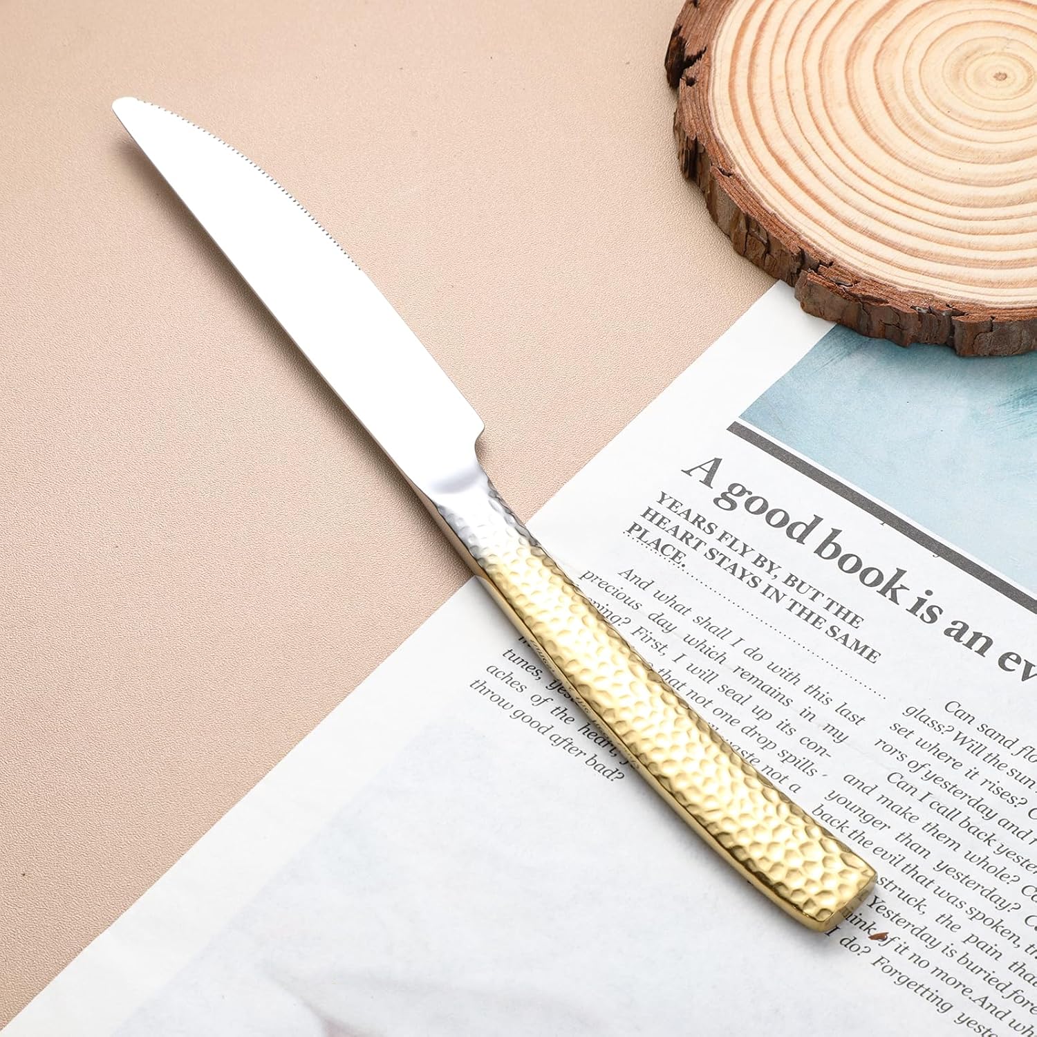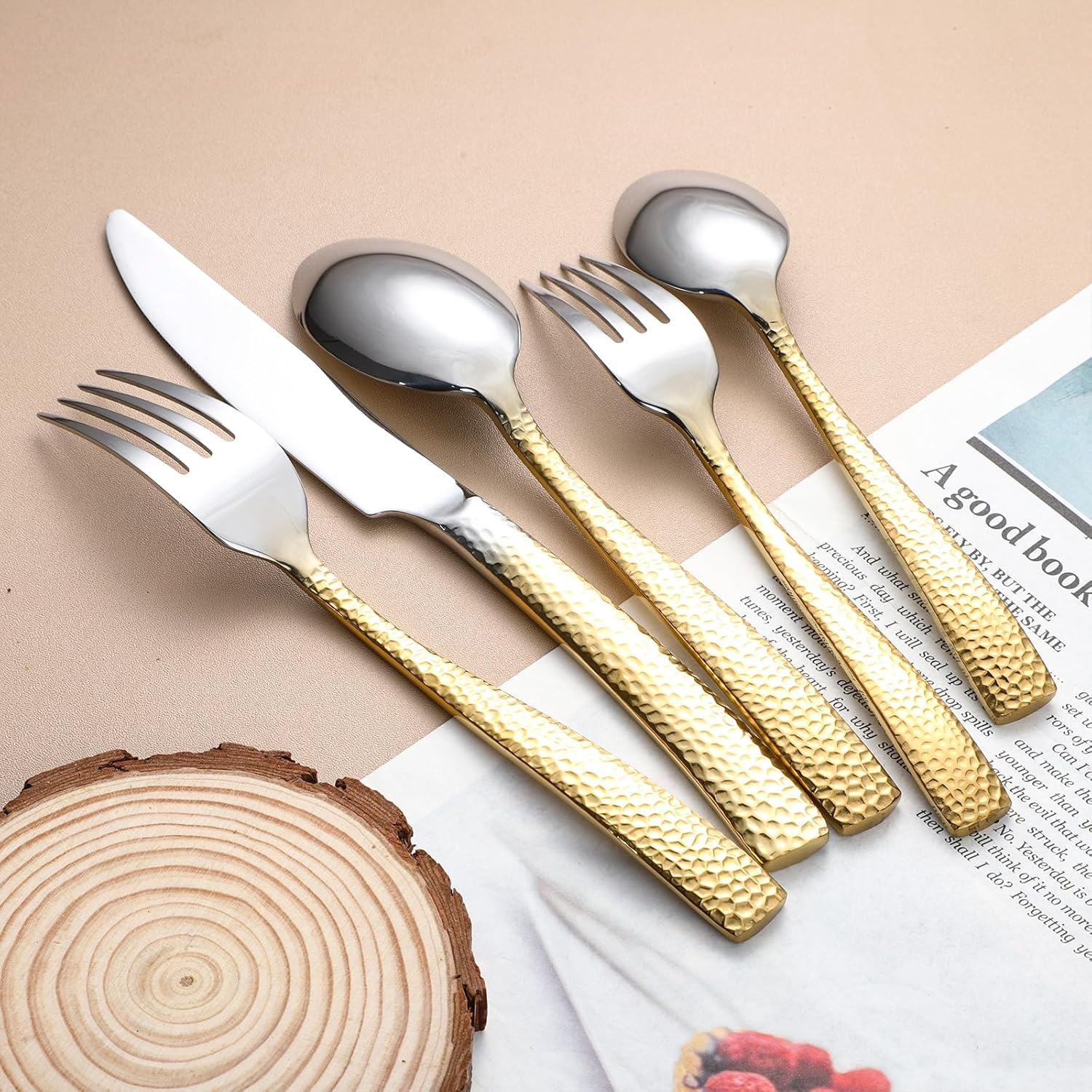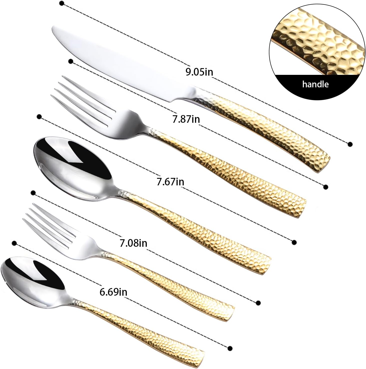 - [Superior Design]:Hammered Silverware Set With Unique Ripple Handles Design,Stylish Hammered Design On The Front Side Of Each Square Handles,Each Piece Is An Ergonomic Design With Every Detail And Angle Considered Keeping Both Function And Balance In Mind.