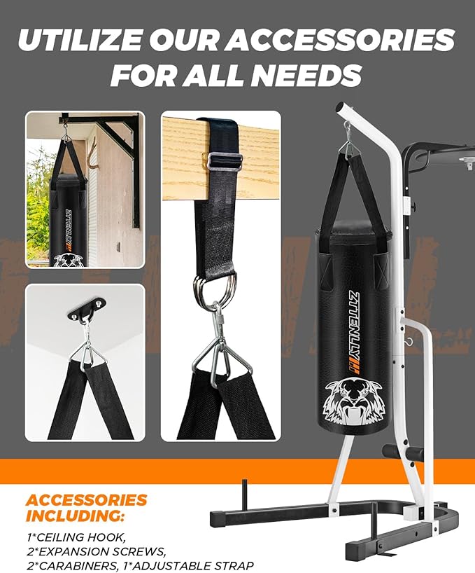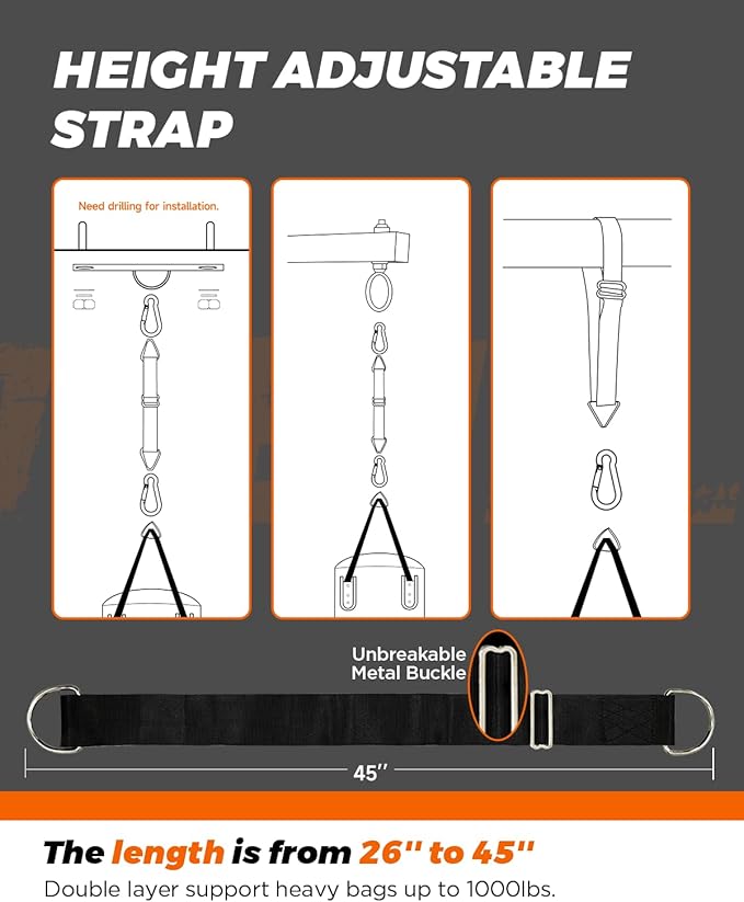 - EASY TO USE: Our boxing bag kit is easy to install and includes everything you need for any boxing scene. The complimentary adjustable strap is for your convenience and can be adjusted from 26" to 45", fitting everyone's needs easily.