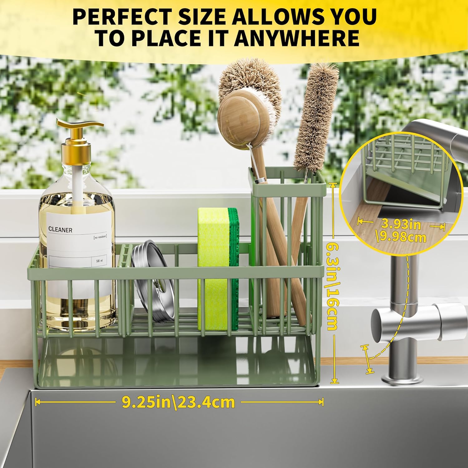 - 【SMALL VOLUME】 Cisily sponge holder is suitable for kitchens with limited space. It measures only 9.25"*3.97"*6.37", Holds a detergent bottle, a sponge ball and sink stopper. With an extra upgraded brush holder that can hold up to 4 small and large sized brushes, with the Cisily Sink caddy you can save countertop space perfectly.