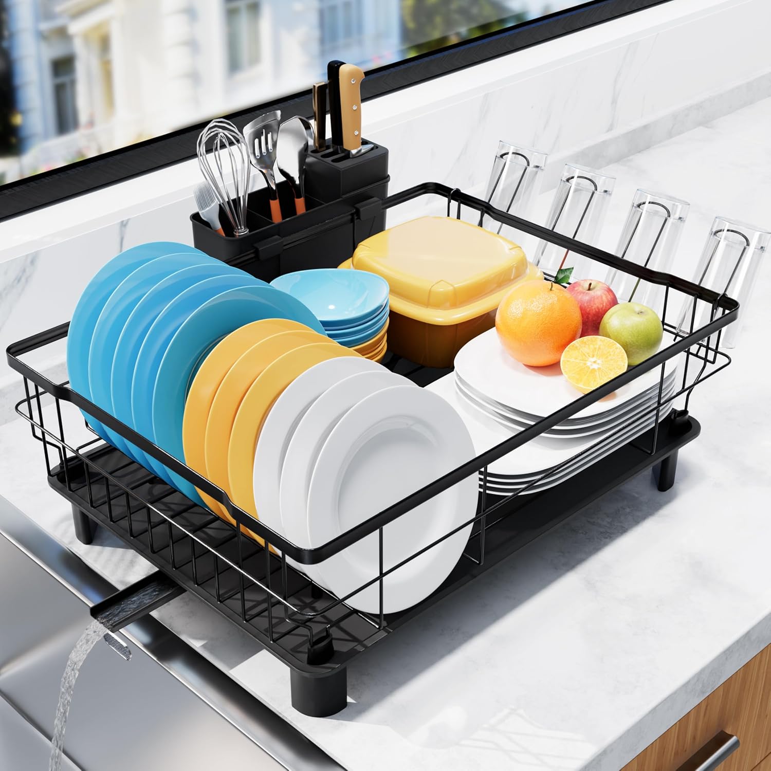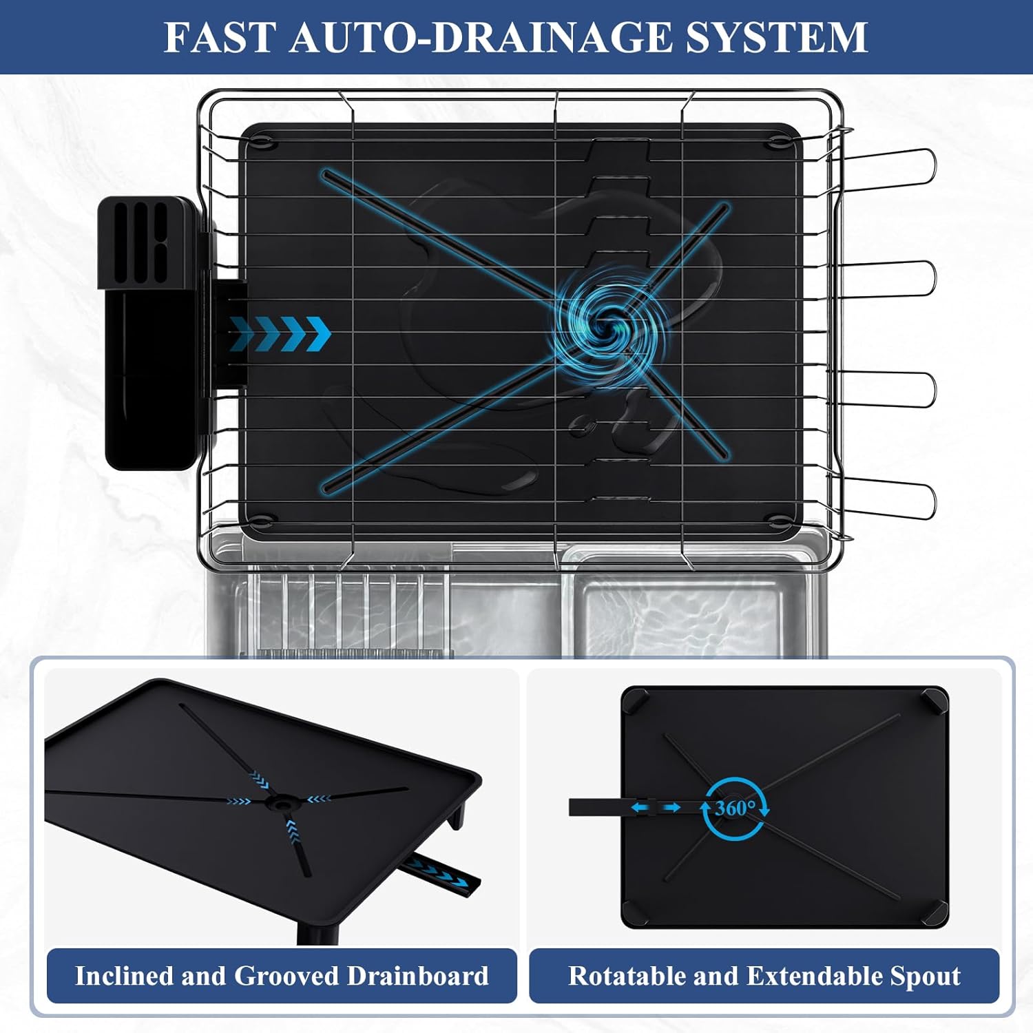 - FAST AUTO-DRAINAGE: The dish drying rack features a slanted drainboard with a central hole and piston, along with grooved channels for efficient and rapid drainage. It’s also equipped with an extendable and 360° rotatable spout allowing it to perfectly fit different kitchen sink