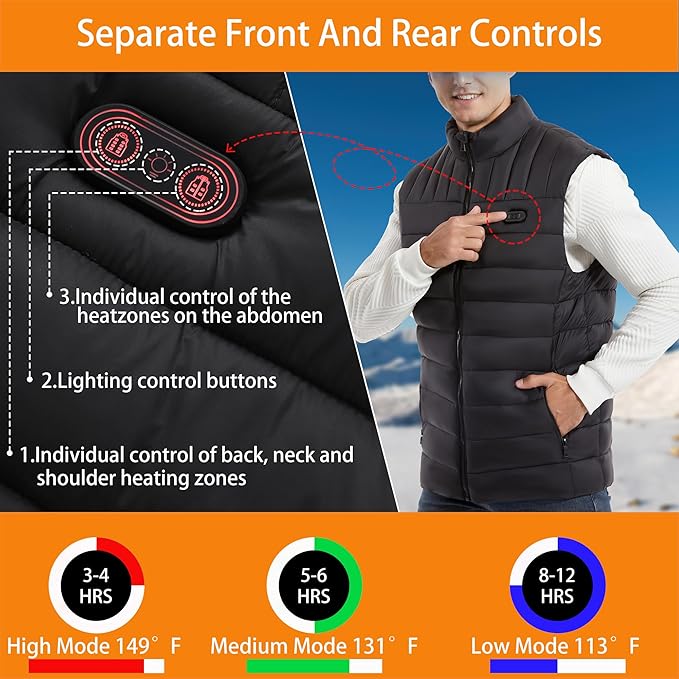 • 【Independent Front and Back Heating Control】Includes an independent control panel to adjust the heating zones for the front and back separately. Three temperature settings (Low: 45℃/113℉, Medium: 55℃/131℉, High: 65℃/150℉) allow you to customize warmth according to different weather conditions and personal preferences. Perfect for those with conditions like ALS (Amyotrophic Lateral Sclerosis) or other cold-sensitive symptoms, offering reliable warmth while allowing free movement.