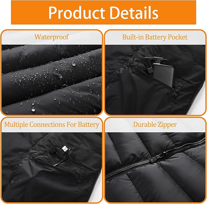 • 【Universal USB Compatibility】Built-in safety module prevents overheating, ensuring 100% safety during use. Designed with a universal USB port, this heated vest is compatible with most common power banks (power bank not included). Choose high-capacity power banks or use multiple batteries for extended warmth. The lightweight design ensures comfort and unrestricted activities throughout your day.
