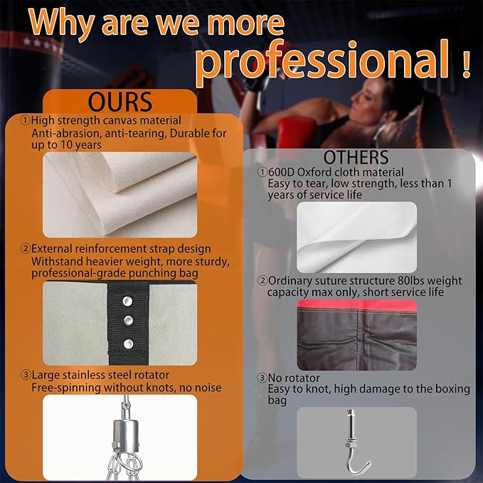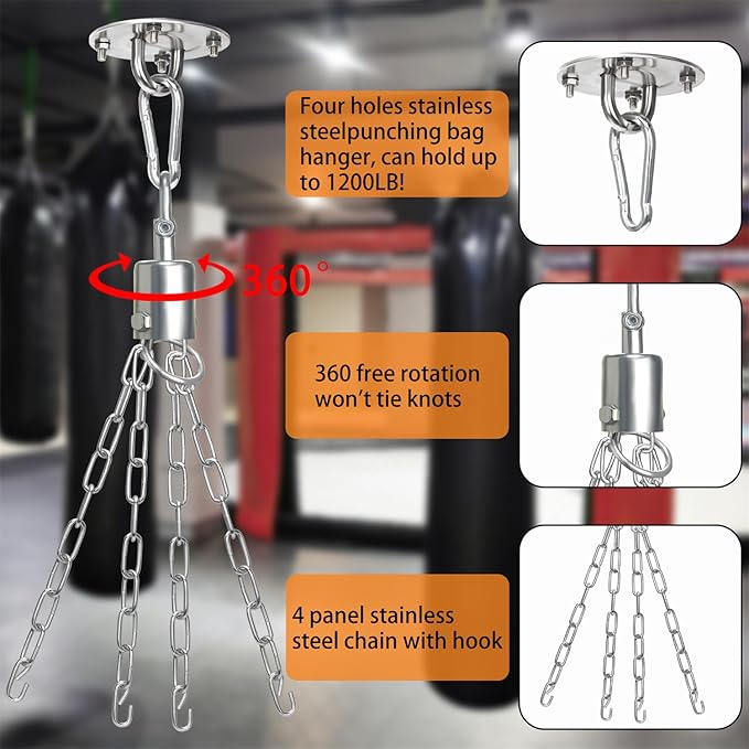 - PUNCH BAG WITH 360° ROTATING HANGER: Swivel Hanger allows the heavy bag/saco-de-boxeo to rotate freely without knotting after impact. The stainless steel material make it can hold up to 1200LB! Hang the bag indoors or your home rooms and start your boxing training
