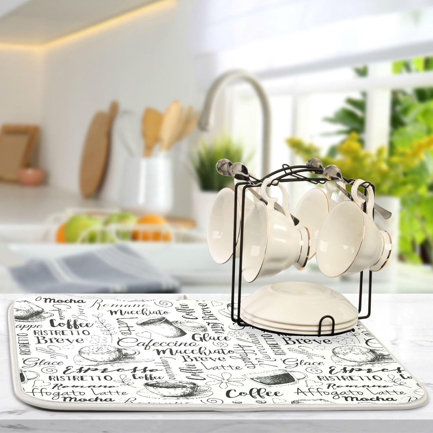 Coffee Cups Print Dish Drying Mat for Kitchen Counter Absorbent Microfiber Drying Pad, Medium 16x18 in, Reversible Drainer Mats