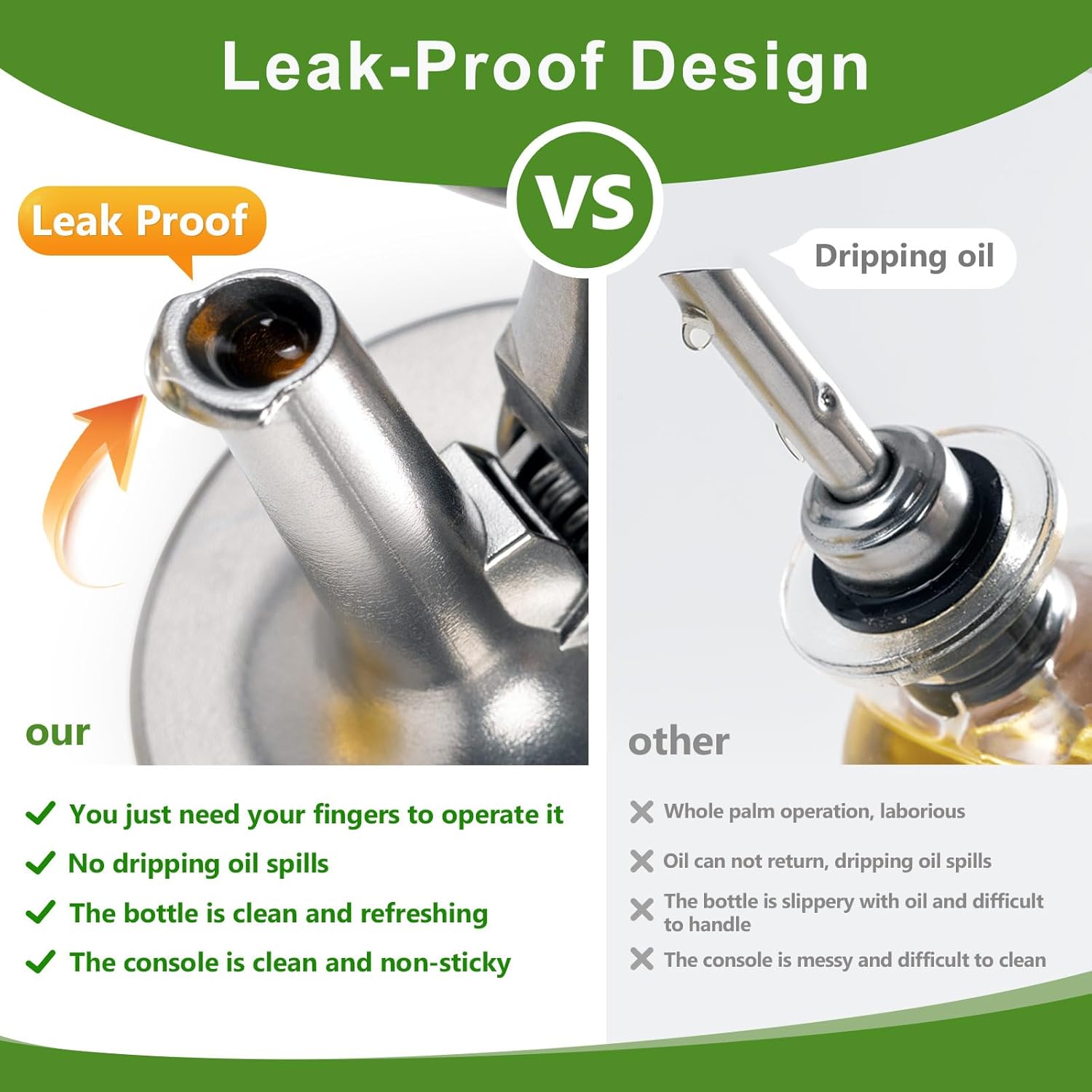 - Leak Proof Spout: This oil dispenser is designed with stainless steel pour spouts, sealed cap and flap cap that prevents oil from leaking and also keeps dust from contaminating the liquid.Keep your olive oil fresh,Pour Spout FDA and European Food Grade test passed