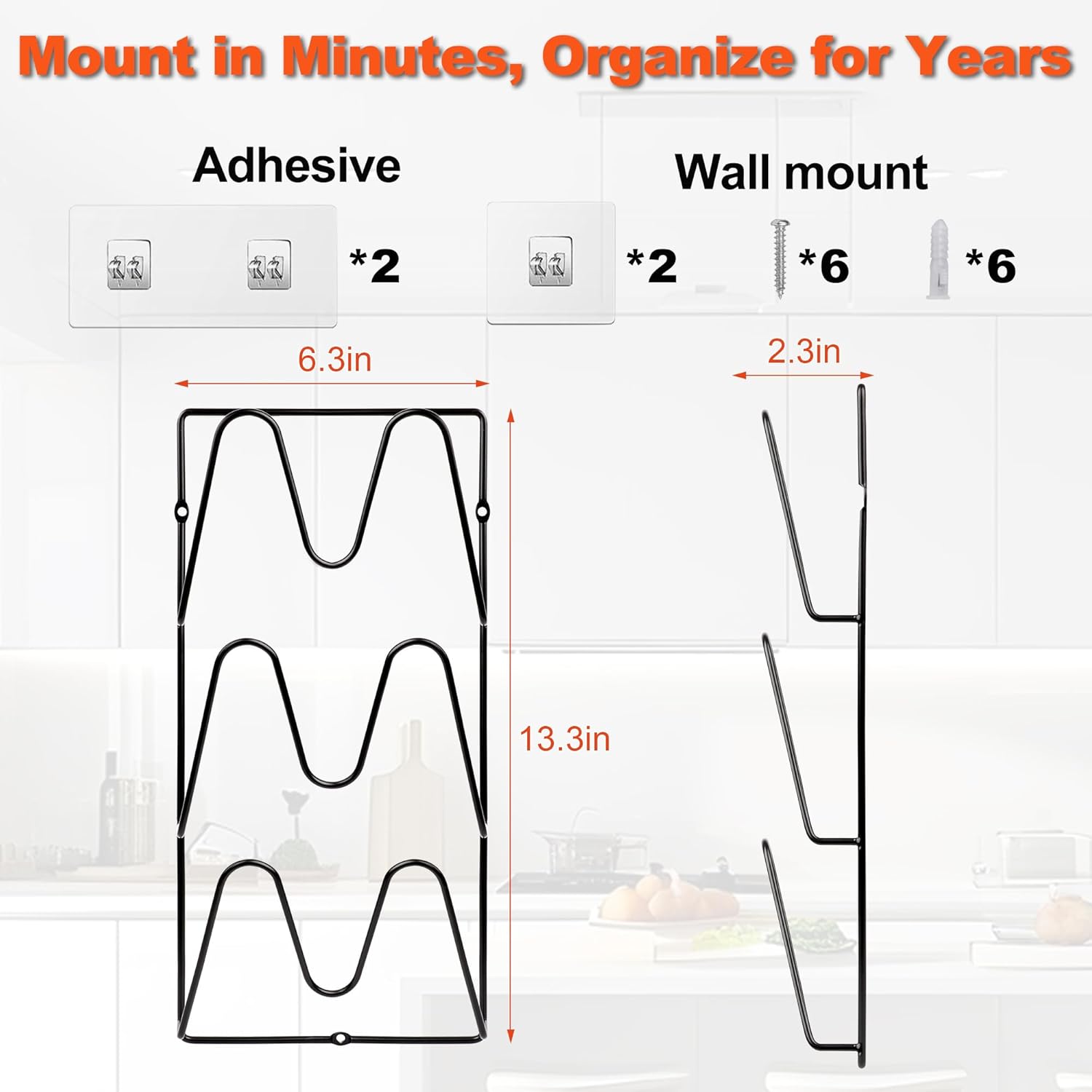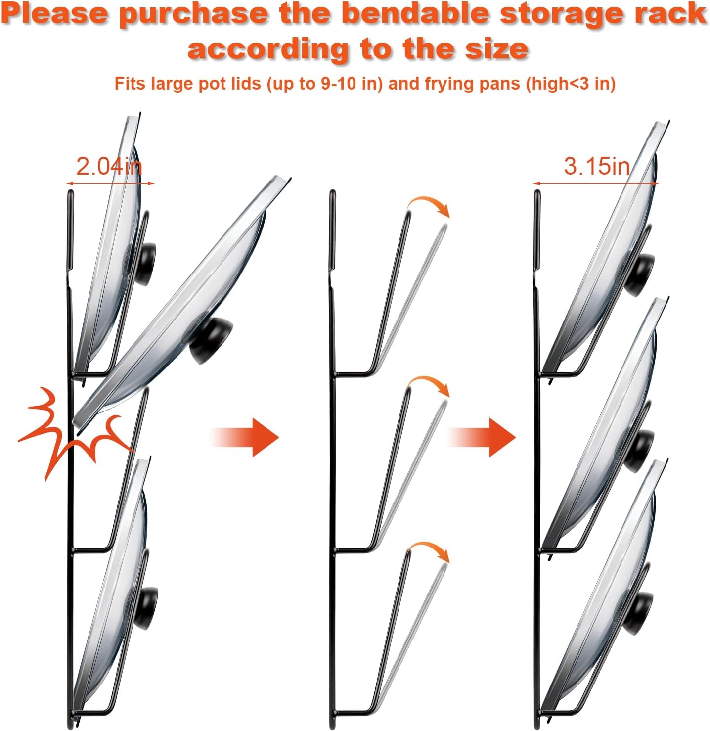 - STURDY WALL STORAGE RACK: This Wall-mounted storage pot lids is made of sturdy rust-proof material. It can be used as a cabinet pot lid organizer to store pots and pans for a long time even in a humid environment (holds up to 22 pounds)
