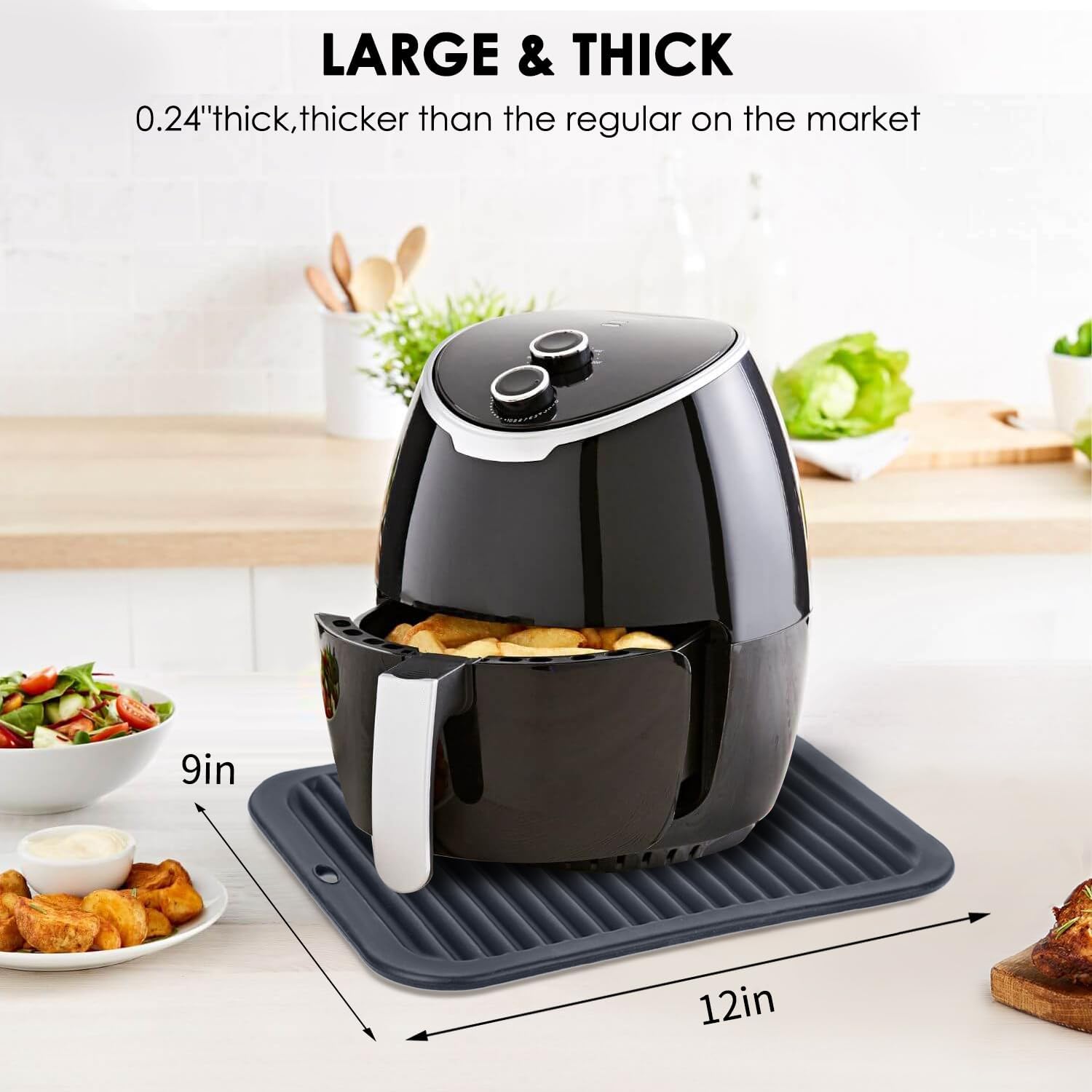 - 🍳Silicone Heat Resistant Mat: The 4 pack dark grey silicone trivets for kitchen heat resistance are -104℉ to 446℉. Safe to use for microwave, air fryer, oven, toaster, or freezer. Perfect protecting granite countertops, wooden tables, and glass tables from heat damage, scratches, stains, etc. Extend the life of the tabletop.
