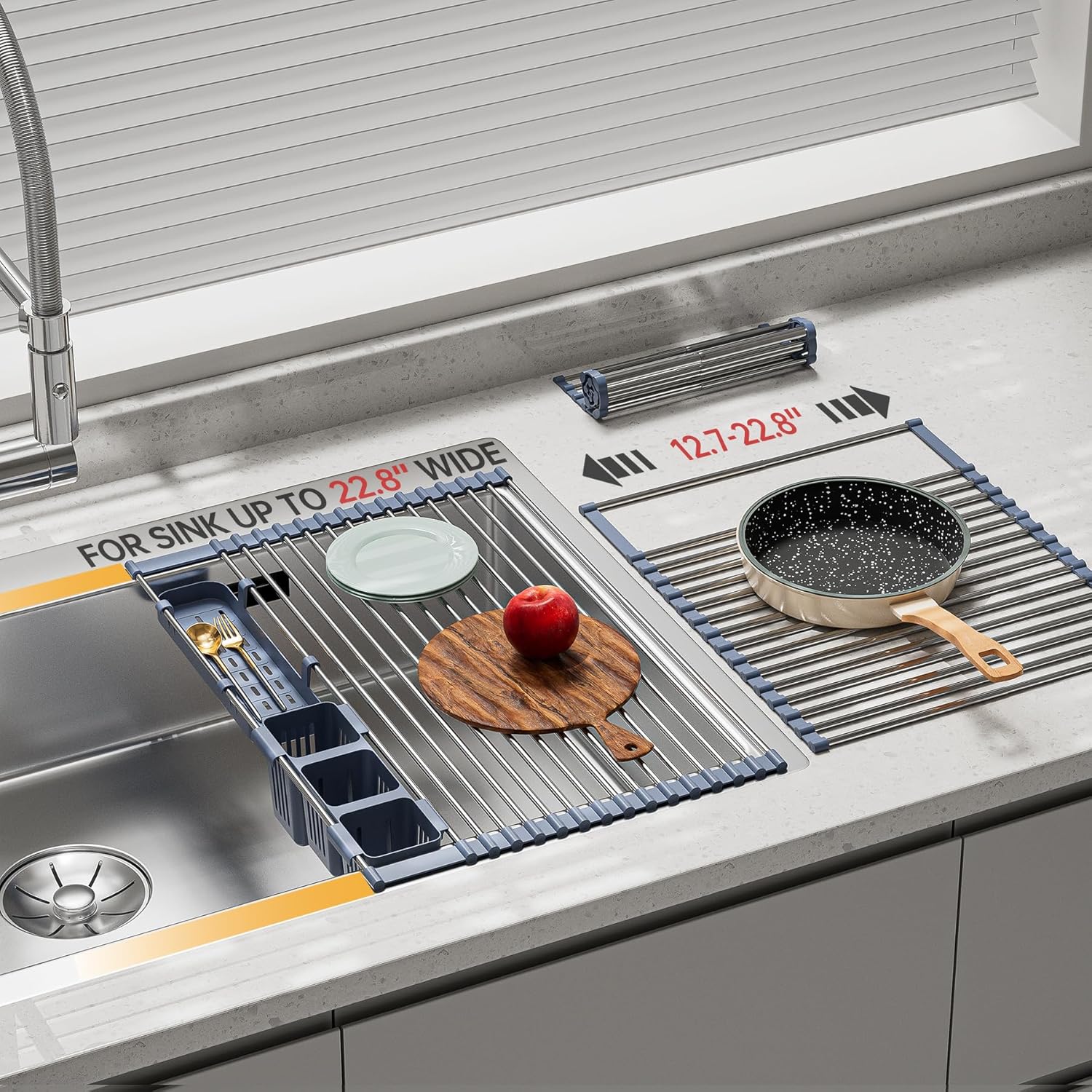 - SPACE SAVING, FOLDABLE DESIGN: Just 10s to easily roll it up for storage and help you organize your kitchen.Works great and keeps the kitchen sink area looking neat, the best one of dish drainers for the kitchen counter. This design not only saves space but is also easy to clean. The silicone surface just needs a rag to wipe clean. A great addition as a kitchen sink organizer and an apartment must-have. It will be a warm gift for a new home.