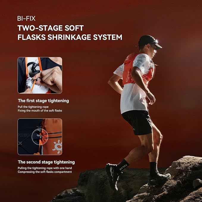 • 3D CUTTING: Using vest-style 3D cutting, the center of gravity of the hydration pack is fixed in a higher position on your torso, the weight balance is transmitted to the entire torso, shoulders and chest weight balance, reducing the pressure on your hips and lower limbs, and the body maintains dynamic balance during running, twists comfortably, and stretches freely