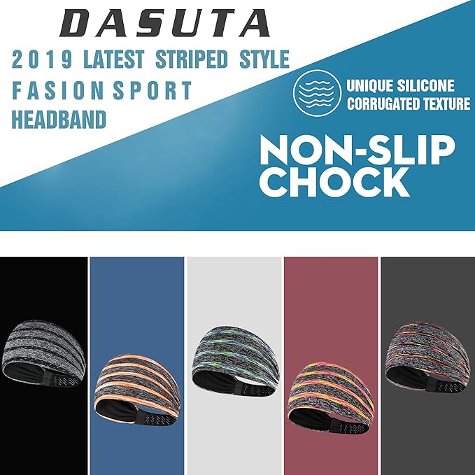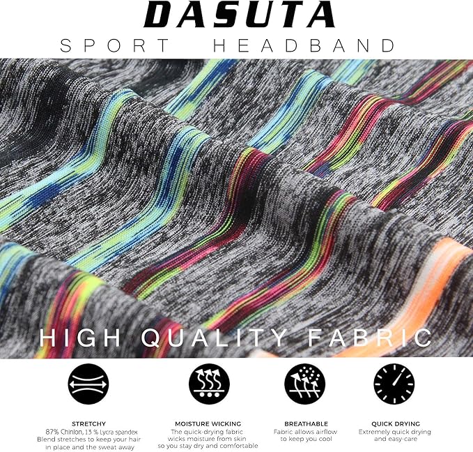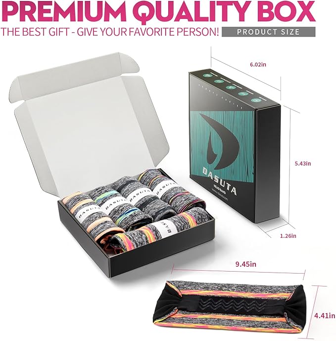 - A set of 5 different Color Headbands in a Gift Box:5 different, vibrant colors, Whether you are exercising or everyday wear!Stylish design style! Improve your personal charm immediately!Use very widely:Perfect in everyday wearing and all kinds for sports activities like yoga , soccer, Running, Travel, Working, Fitness, basketball, baseball, football , Mountaineering, etc.We headband packed in our DASUTA brand gift box, very suitable as a gift for your favorite people!