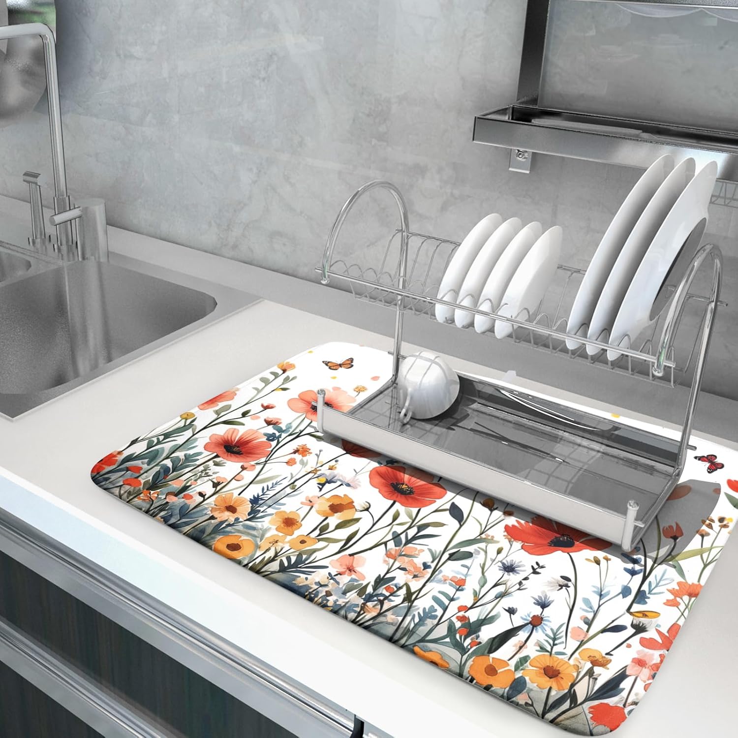 - 【Wide Usage】The dish drying mat designed with colorful butterfly pattern, it is beautiful, soft, and durable. Not only a dish drying mat, cup mat, heat resistant mat, you can also use it as a kitchen countertop insulation mat. It is also a good choice to use it as a pet mat, picnic mat.