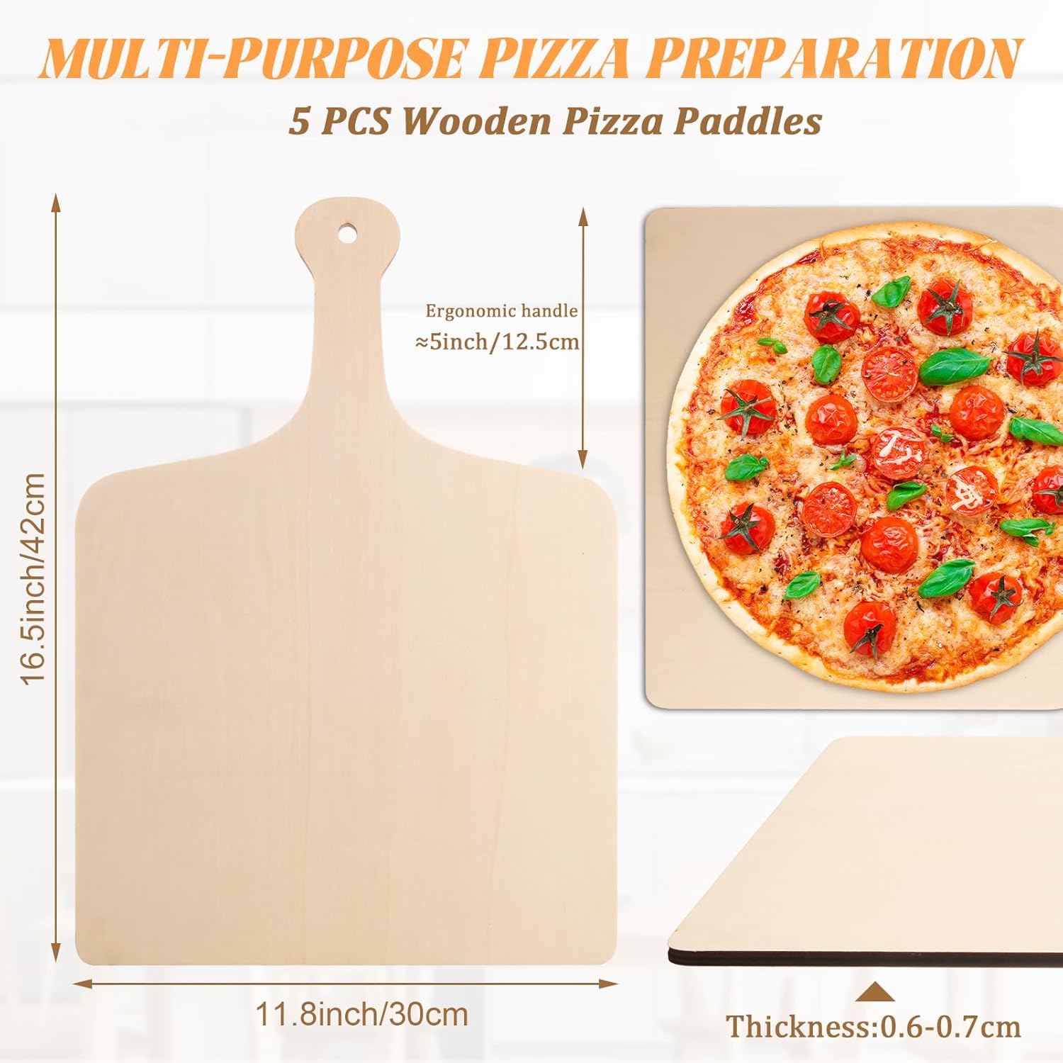 - Size: Set of 5 Wooden Pizza Paddles (16.53x11.81 inch / 42x30 cm each) with 5 inch / 12cm ergonomic handles. Optimized 1/4 inch (0.6-0.7cm) thickness balances sturdiness and lightweight control for smooth oven transfers