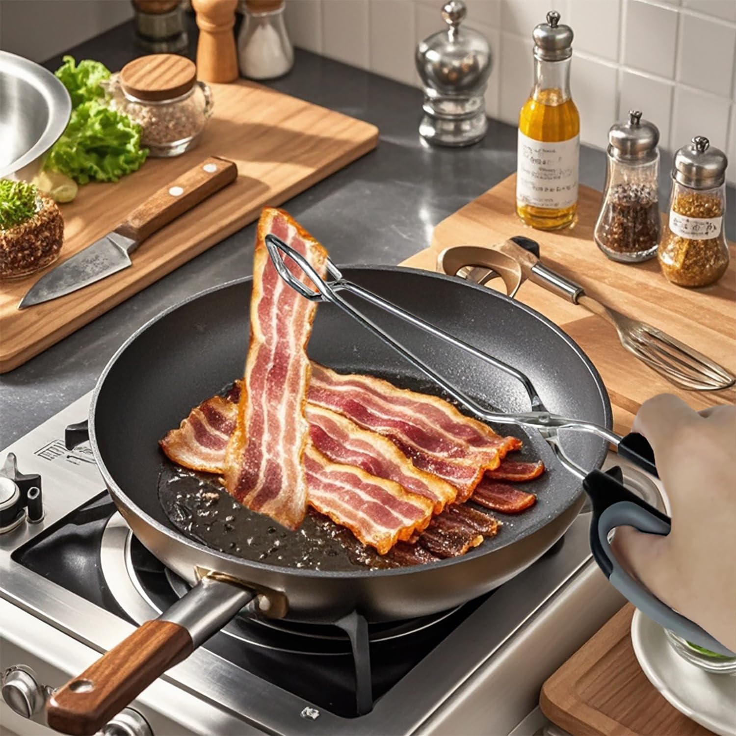 - MULTIPLE APPLICATIONS - The tong gripper has an imprint on metal to prevent food slippage, great for grilling in the kitchen or outdoor barbecue. Works well for turning and lifting meat, fish, crab, chicken, turkey, burger, hotdog, corn, vegetable salad and taco etc.