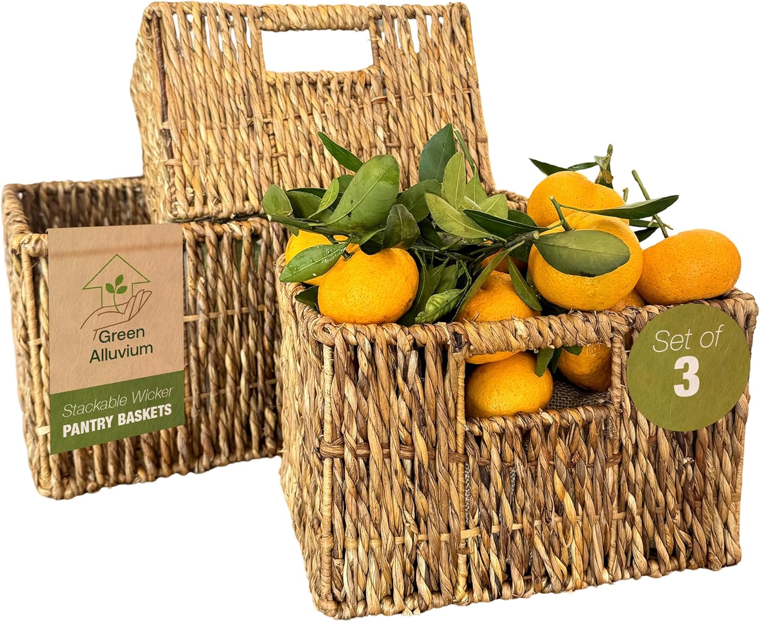 Wicker Basket Set – Stackable Storage Bins for Organizing Pantry & Kitchen – 1 Large Basket + 2 Small Baskets with Handle – Wicker Storage Baskets for Shelves & More