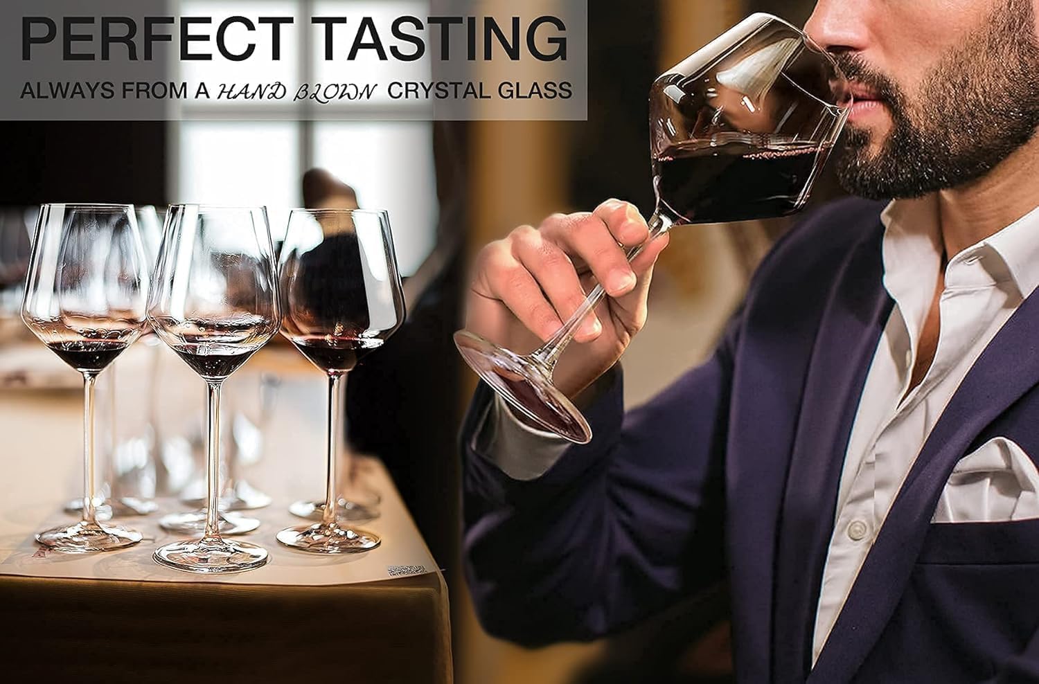 - Exquisite Design for Red Wine Glasses: LUNA & MANTHA red wine glasses is designed having in mind elegance and simplicity. The perfect cold-cut rim and delicate lines as well as the unique shape of the bowl ensure that wine lovers can enjoy Burgundy, Cabernet Sauvignon, Pinot, Bordeaux, and more, allowing your wine to be balanced between acidity and sweetness