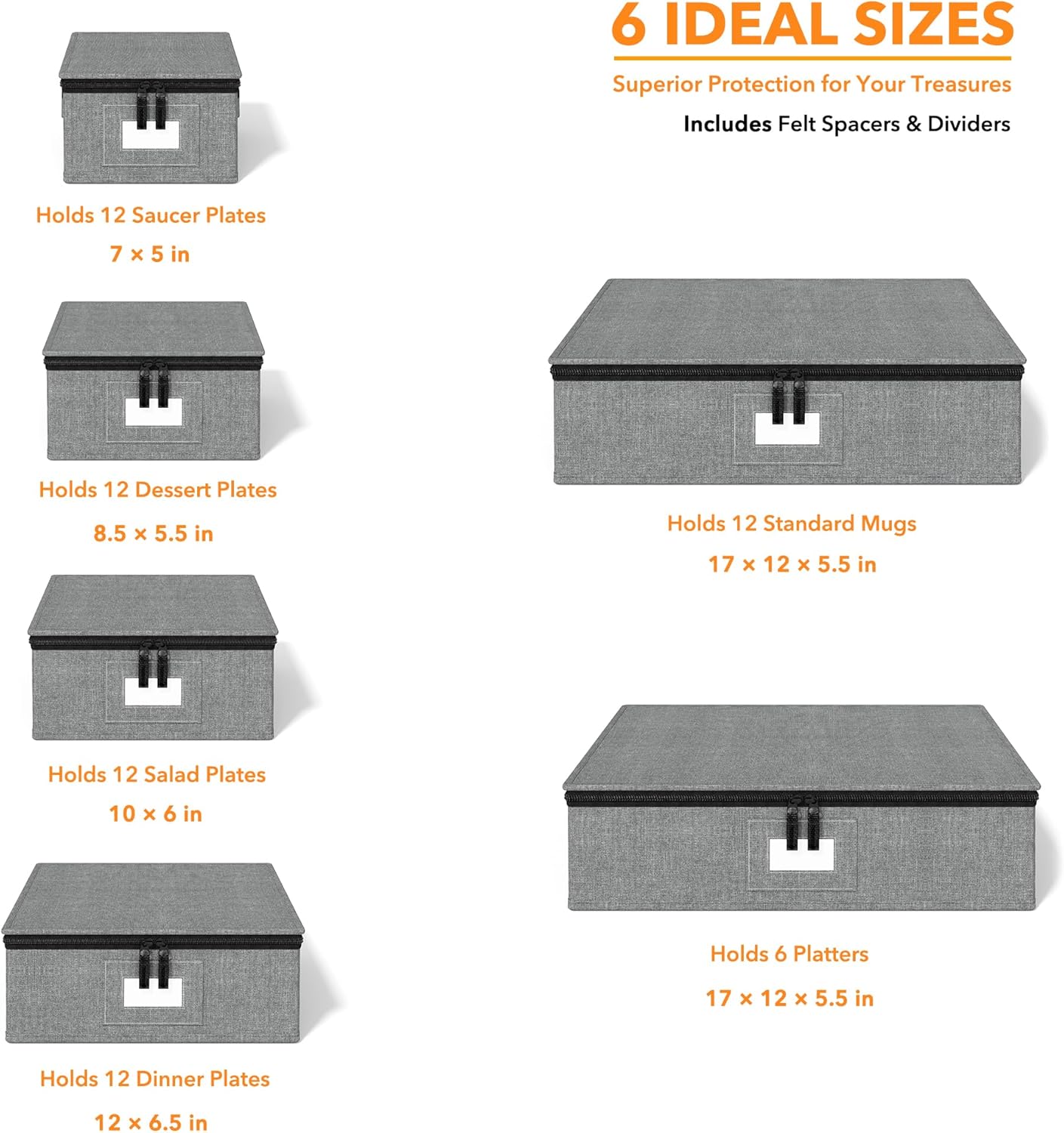 - Comprehensive Set: Included in this package are five versatile storage units, varying in size from large to compact, to accommodate an extensive range of dinnerware sizes. 1 dinner plate case, 1 salad plate case, 1 dessert plate case, 1 saucer plate case, 1 platter case, and 1 coffee mugs case. Also includes felt dividers.