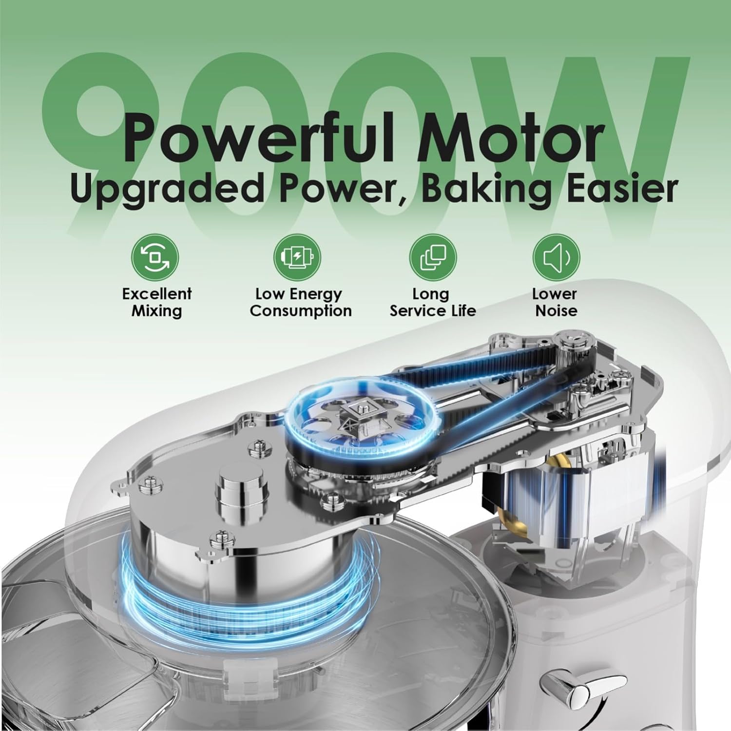 - 900W Powerful Motor: Equipped with a 900W pure copper motor, this mixer delivers robust power with smooth and efficient performance.The high-powered motor effortlessly handles heavy dough and thick mixtures while also providing precision whipping for delicate textures and consistent blending. Whether for daily use or complex baking needs, it delivers ideal results.