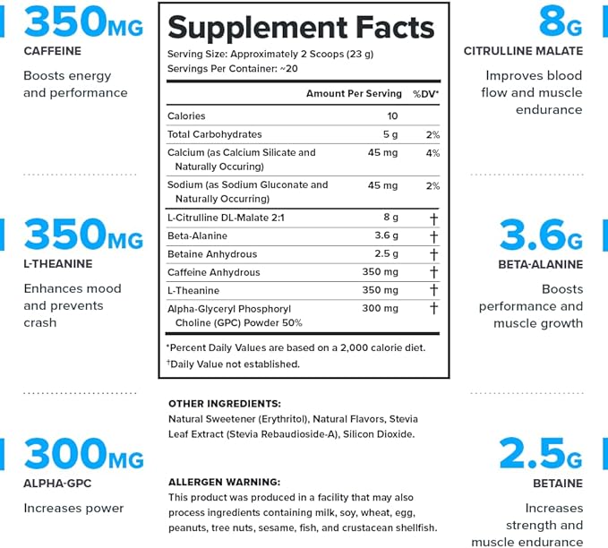 - Get the only naturally sweetened and flavored pre workout powder with clinically effective doses of 6 ingredients that increase energy, focus, strength, and stamina without any jitters or post-workout crash.