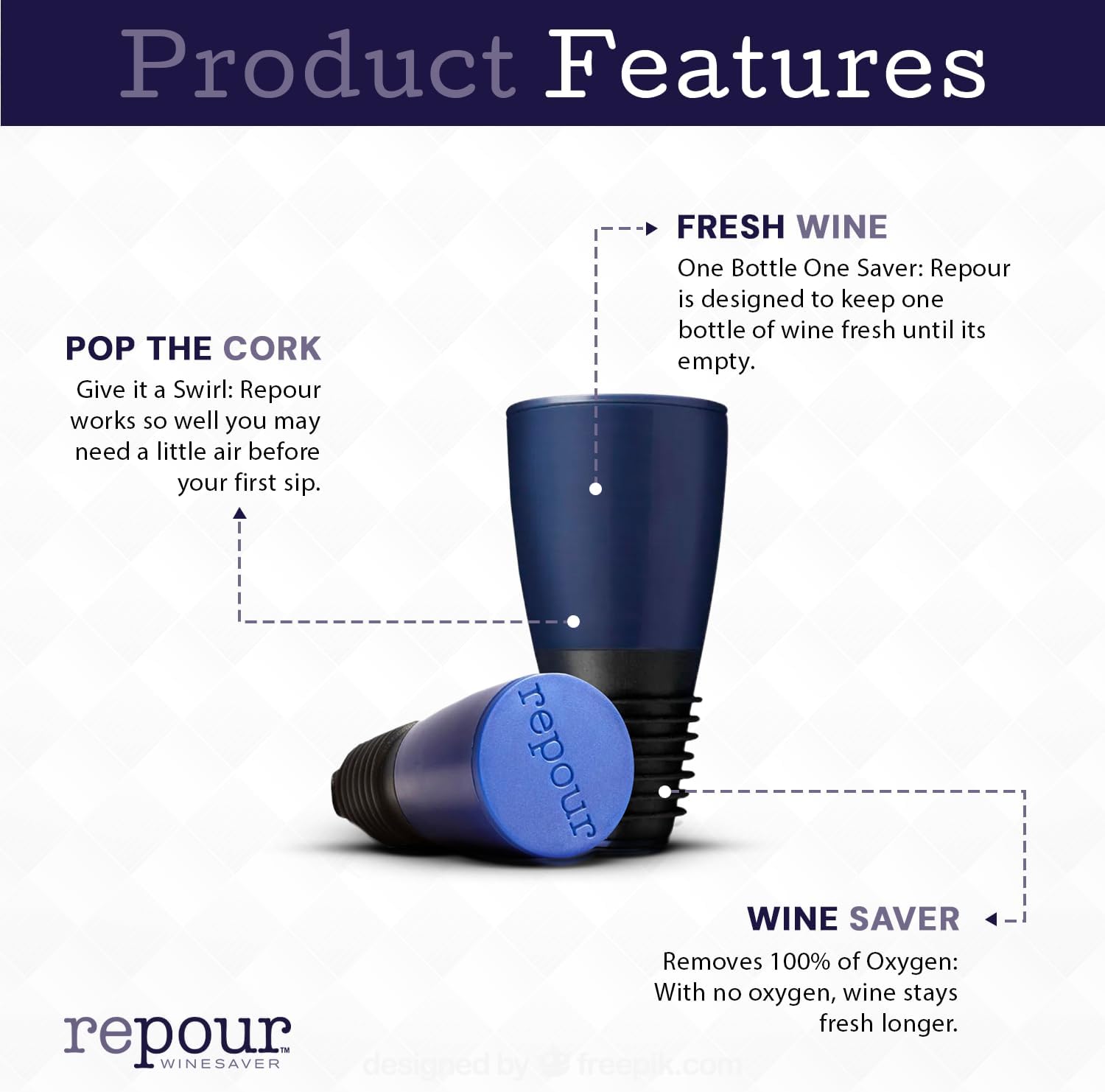 - Keep Wine Fresh for Weeks: The Repour Wine Saver preserves the freshness of your wine by eliminating oxygen from the bottle. One Repour stopper lasts the entire life of a 750 ml bottle, maintaining the wine’s original flavor and aromas for up to 2 months between pours. Repour is suitable for most 750ml bottles except for sparkling wine. One Repour is good for the life of a single bottle of wine. When the bottle is empty, so is Repour.