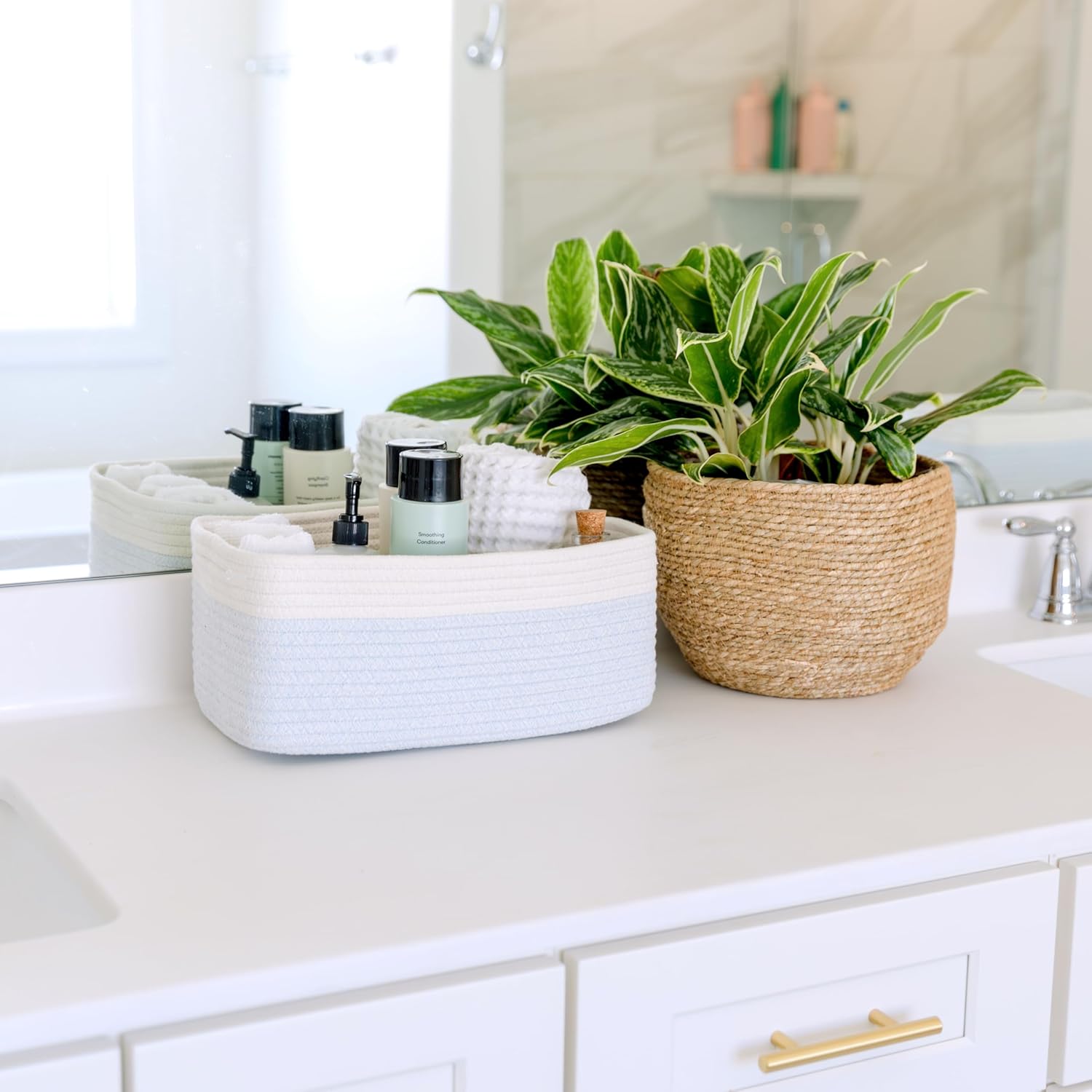 - Safe, Natural Cotton Organizer Bins: Crafted from the highest quality material in the market, our storage bins are oh-so-sturdy (and cute) and ready to take on little humans. They’re 100% safe, so you can rest easy if teething toddlers take a nibble. Reinforced Hidden Handles: Now you see ‘em, now you don’t! With completely hidden handles that blend seamlessly into the rope basket, you’ll be the Houdini of home organizing. They’re even double-stitched and reinforced for extra heavy loads!
