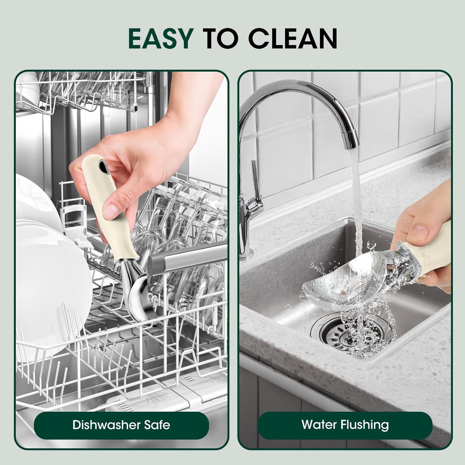 - Effort-Saving Extended Handle: Designed with a lengthened handle and an ergonomic concave arc for enhanced finger stability, this ice cream scoop ensures a stable grip while reducing wrist strain. The soft rubber-wrapped handle provides a comfortable, anti-slip hold for effortless use
