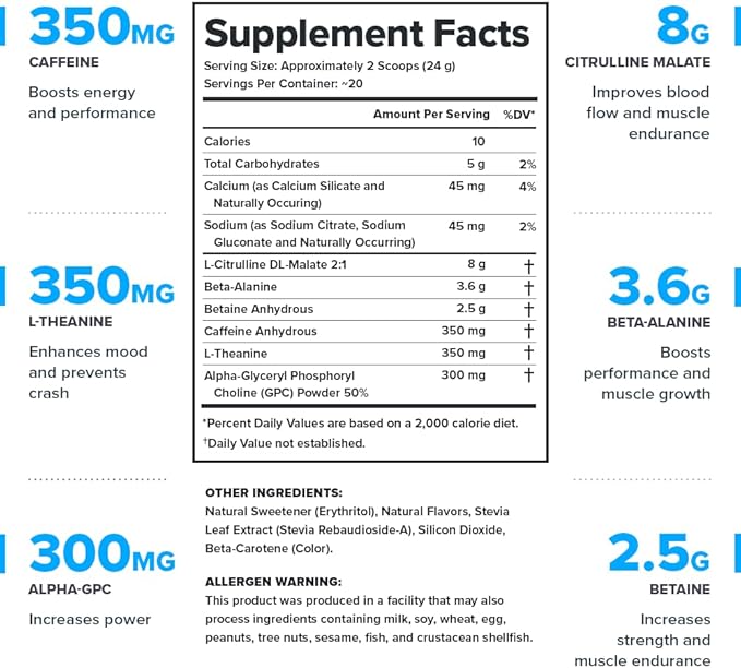 - Get the only naturally sweetened and flavored pre workout powder with clinically effective doses of 6 ingredients that increase energy, focus, strength, and stamina without any jitters or post-workout crash.