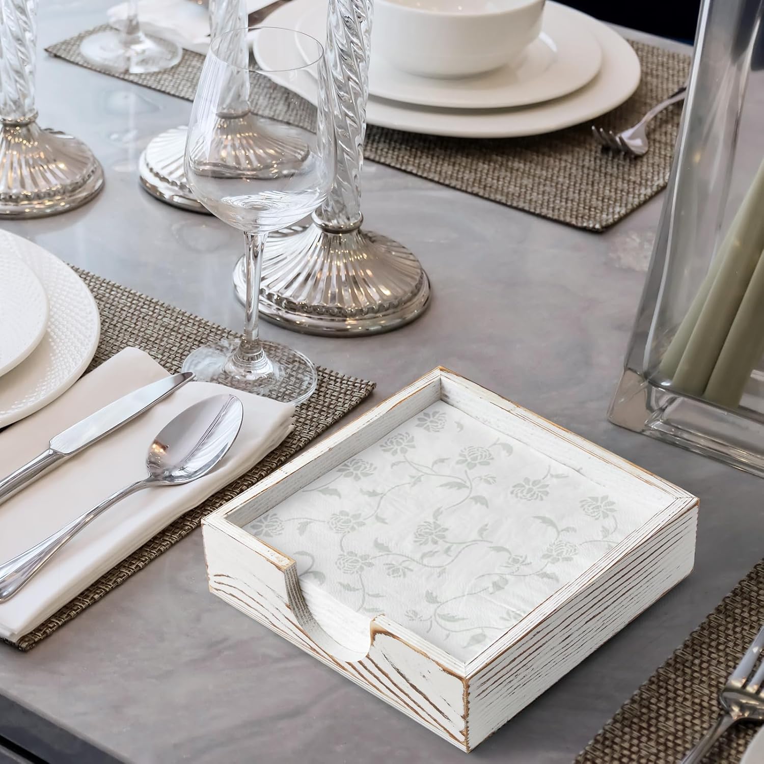 Napkin Holder for Table, White Washed Wood Napkins Holders For Paper Napkins, Flat Napkin Holder for Luncheon, Napkin Holders for Kitchen Dinner Decor, Napkin Dispenser for Indoor & Outdoor Use