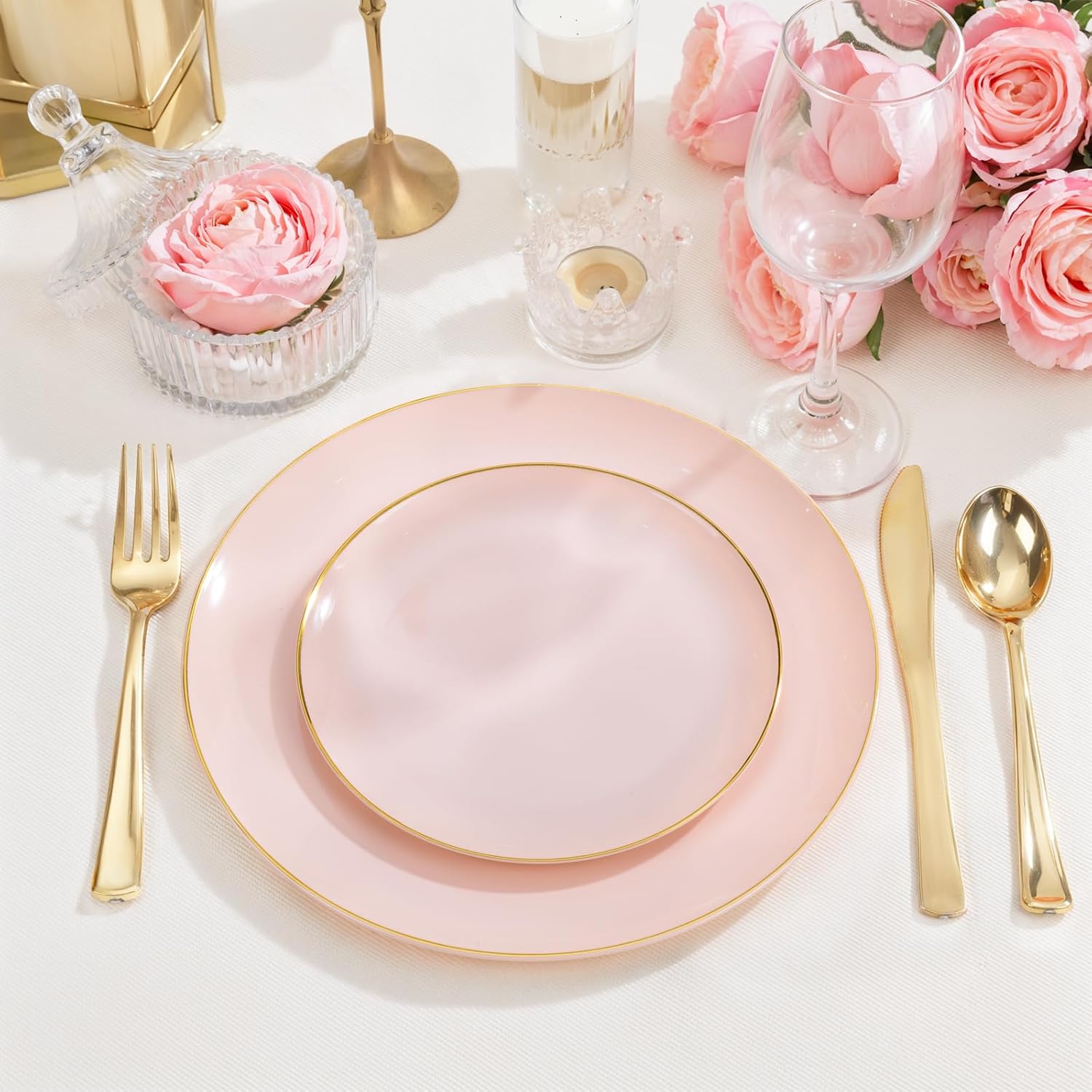 PULOTE 200Pieces Pink Plastic Plates - Premium Hard Pink and Gold Disposable - Include 100PCS 10 inch Dinner & 100PCS 7 inch Dessert Plates, Ideal for Wedding & Party