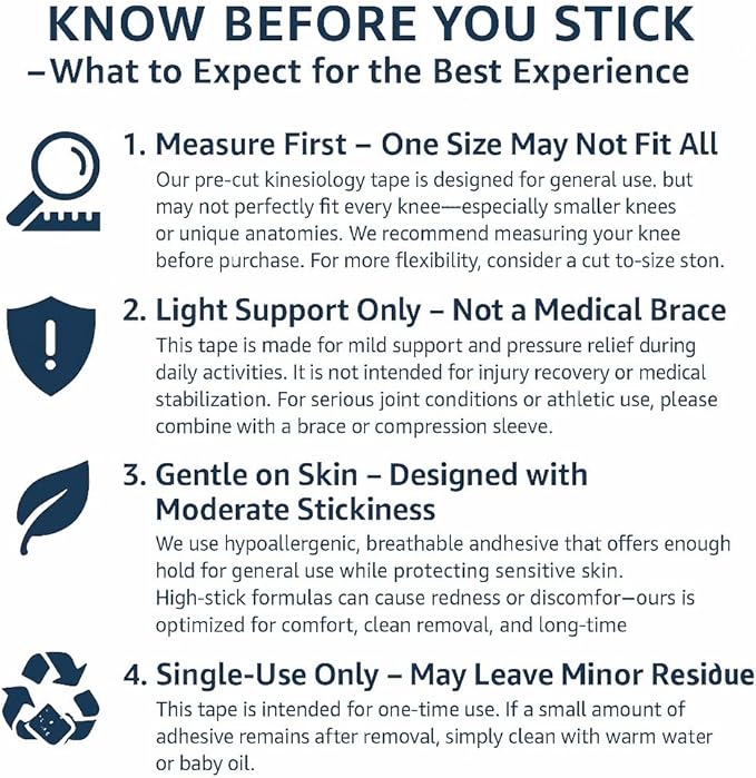 • Enhanced Knee Support & Injury Prevention: Perfect for athletes and active individuals, this kinesiology tape for knees provides essential knee pain relief and stability during sports like basketball, running, or weightlifting. Its knee tape for knee pain relief pre cut design helps prevent injuries by reinforcing the knee joint, reducing strain on muscles and ligaments.