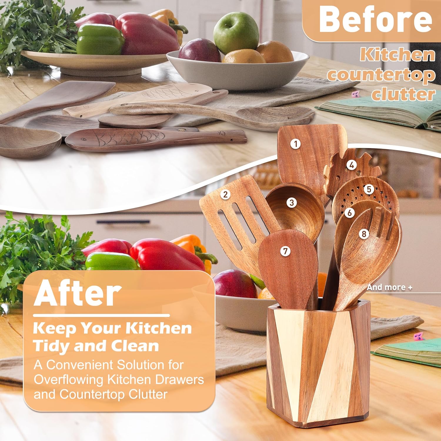 - Rustic Utensil Holder: Handcrafted from solid Acacia wood, this wooden utensil holder set adds a rustic touch to your kitchen. Stylish and reliable, it resists deformation and breakage, keeping your countertop organized with a blend of style and functionality. Perfect for farmhouse decor.
